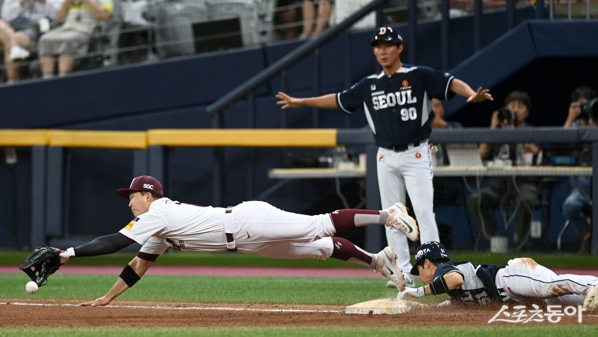 23일 서울 고척스카이돔에서 ‘2023 신한은행 SOL KBO리그’ 두산 베어스와 키움 히어로즈 경기가 열렸다. 5회초 무사 두산 조수행이 기습 번트를 대고 1루에서 세이프 되고 있다.