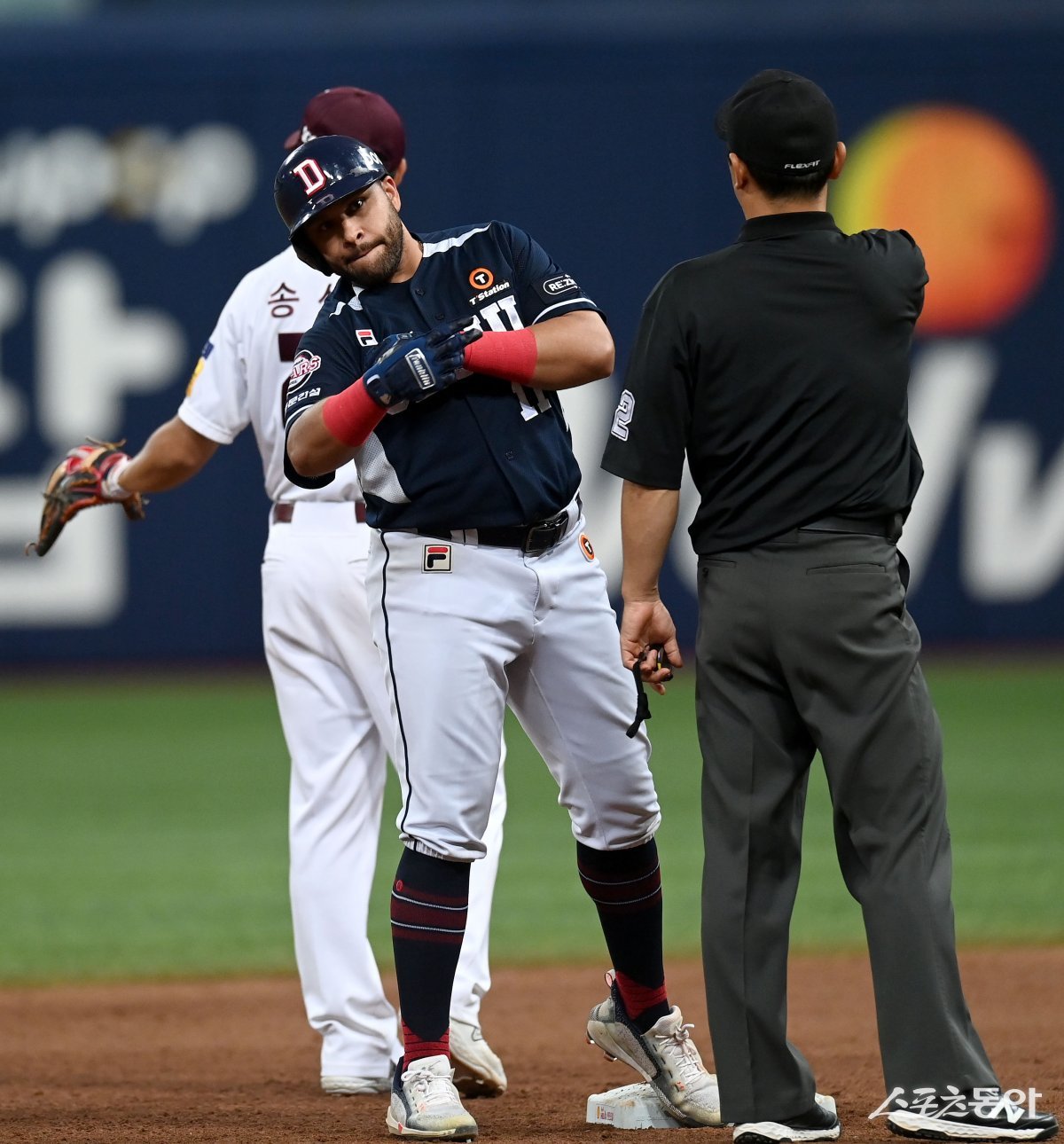 23일 서울 고척스카이돔에서 ‘2023 신한은행 SOL KBO리그’ 두산 베어스와 키움 히어로즈 경기가 열렸다. 7회초 1사 2루 두산 로하스가 1타점 우전 2루타를 치고 2루에서 기뻐하고 있다.