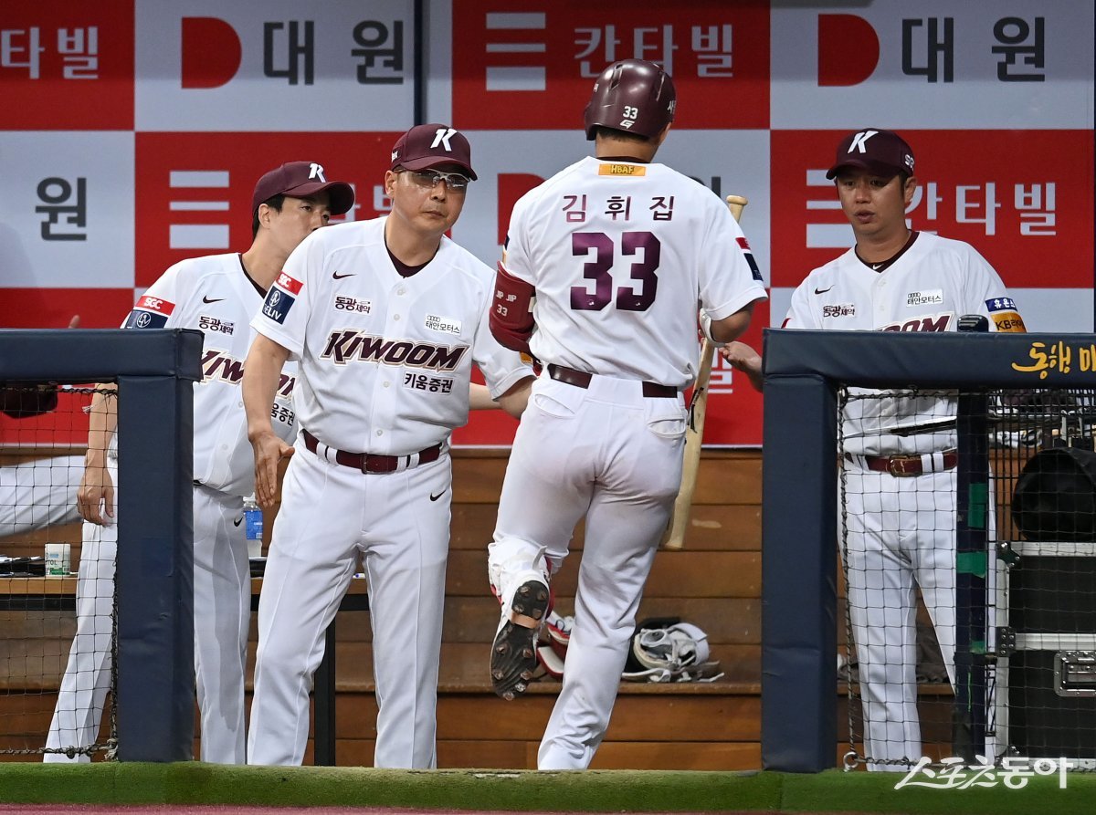 23일 서울 고척스카이돔에서 ‘2023 신한은행 SOL KBO리그’ 두산 베어스와 키움 히어로즈 경기가 열렸다. 7회말 무사 키움 김휘집이 좌월 솔로 홈런을 날리그 그라운드를 돌아 홈인해 홍원기 감독의 축하를 받고 있다.