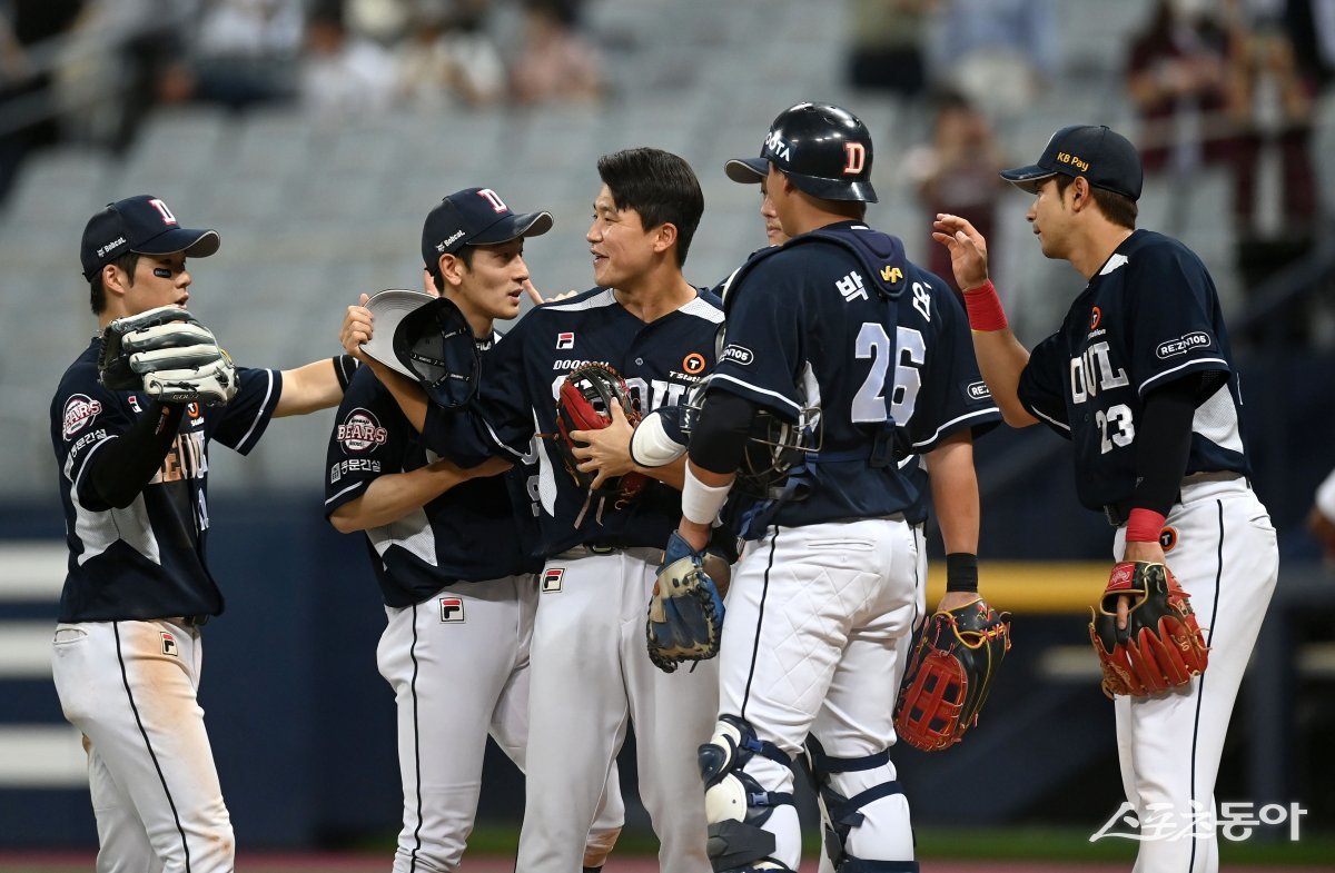 23일 서울 고척스카이돔에서 ‘2023 신한은행 SOL KBO리그’ 두산 베어스와 키움 히어로즈 경기가 열렸다. 11-4 승리를 거두며 위닝시리즈를 기록한 두산 선수들이 하이파이브 하고 있다.