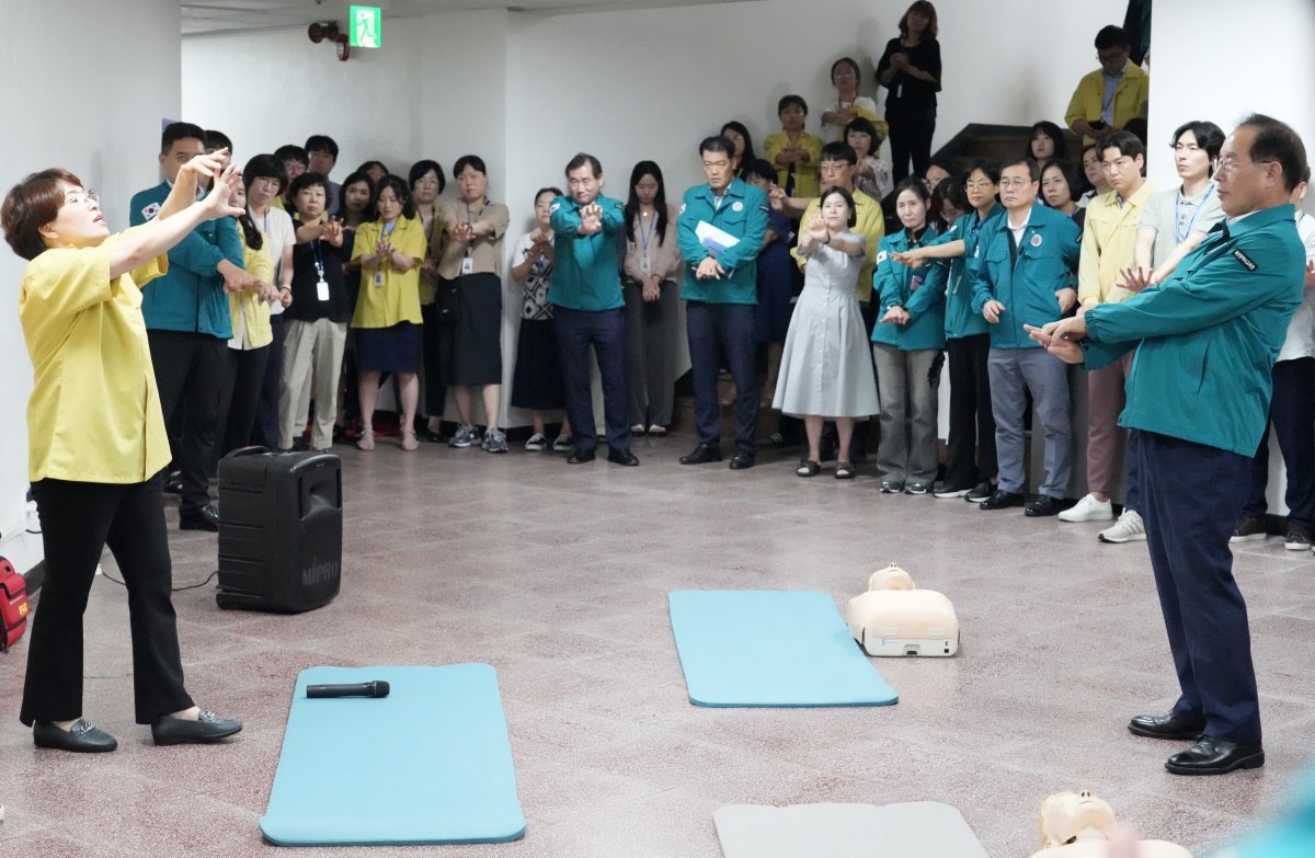 하윤수 부산시교육감(오른쪽)이 직원들과 함께 지난 23일 진행된 ‘2023년 을지연습 민방공 대피 훈련’에서 심폐소생술 교육을 받고 있다. 사진제공ㅣ부산시교육청