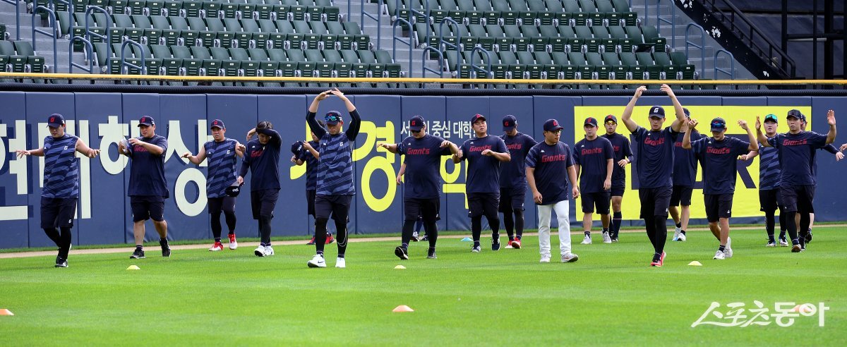 24일 서울 잠실야구장에서 ‘2023 신한은행 SOL KBO리그’ LG 트윈스와 롯데 자이언츠의 경기가 열린다. 경기 전 롯데 선수들이 훈련을 펼치고 있다.