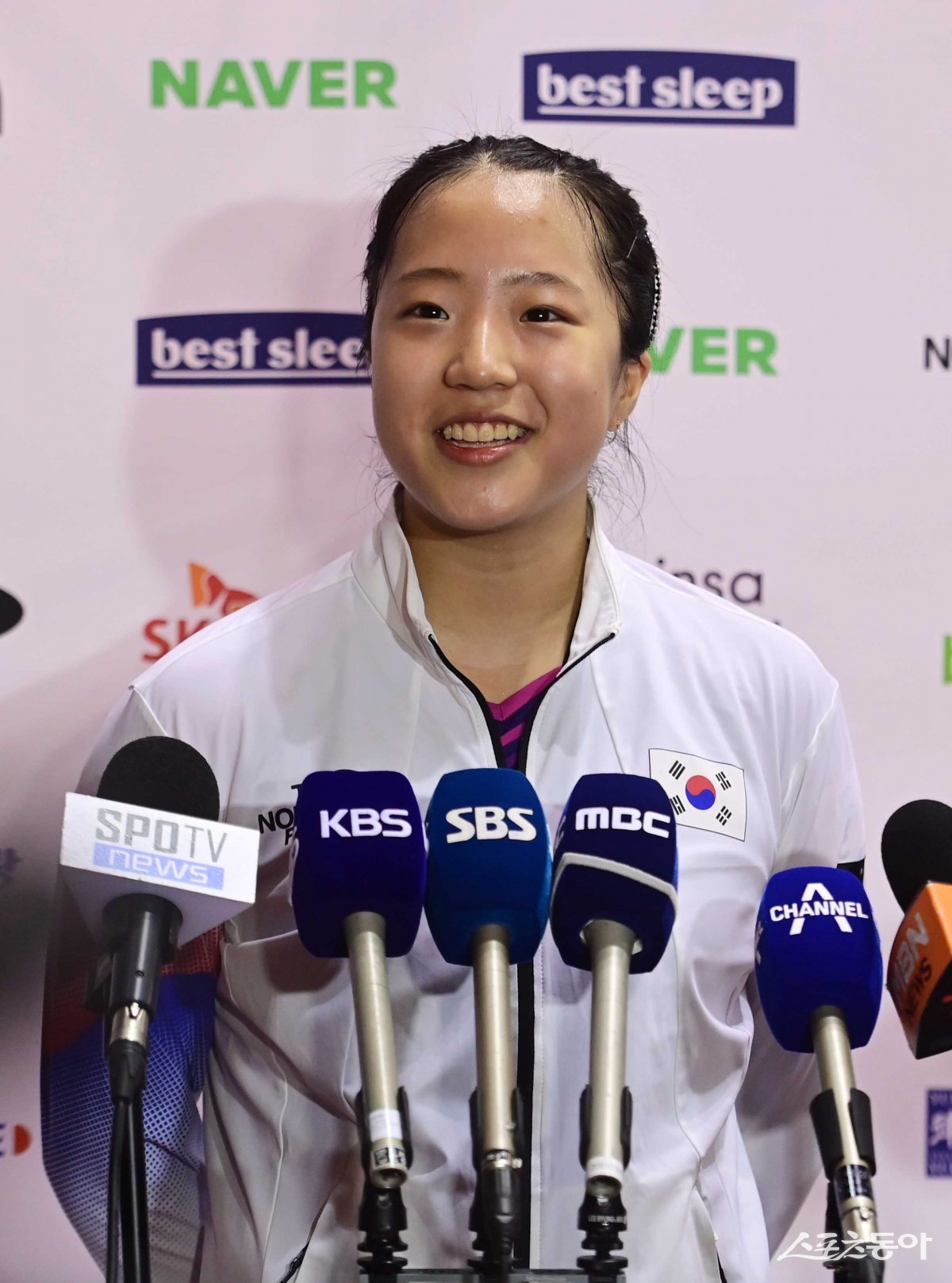 한국탁구대표팀 신유빈이 24일 충북 진천국가대표선수촌에서 열린 ‘2022 항저우아시아경기대회 D-30 미디어데이’에서 인터뷰를 하고 있다.