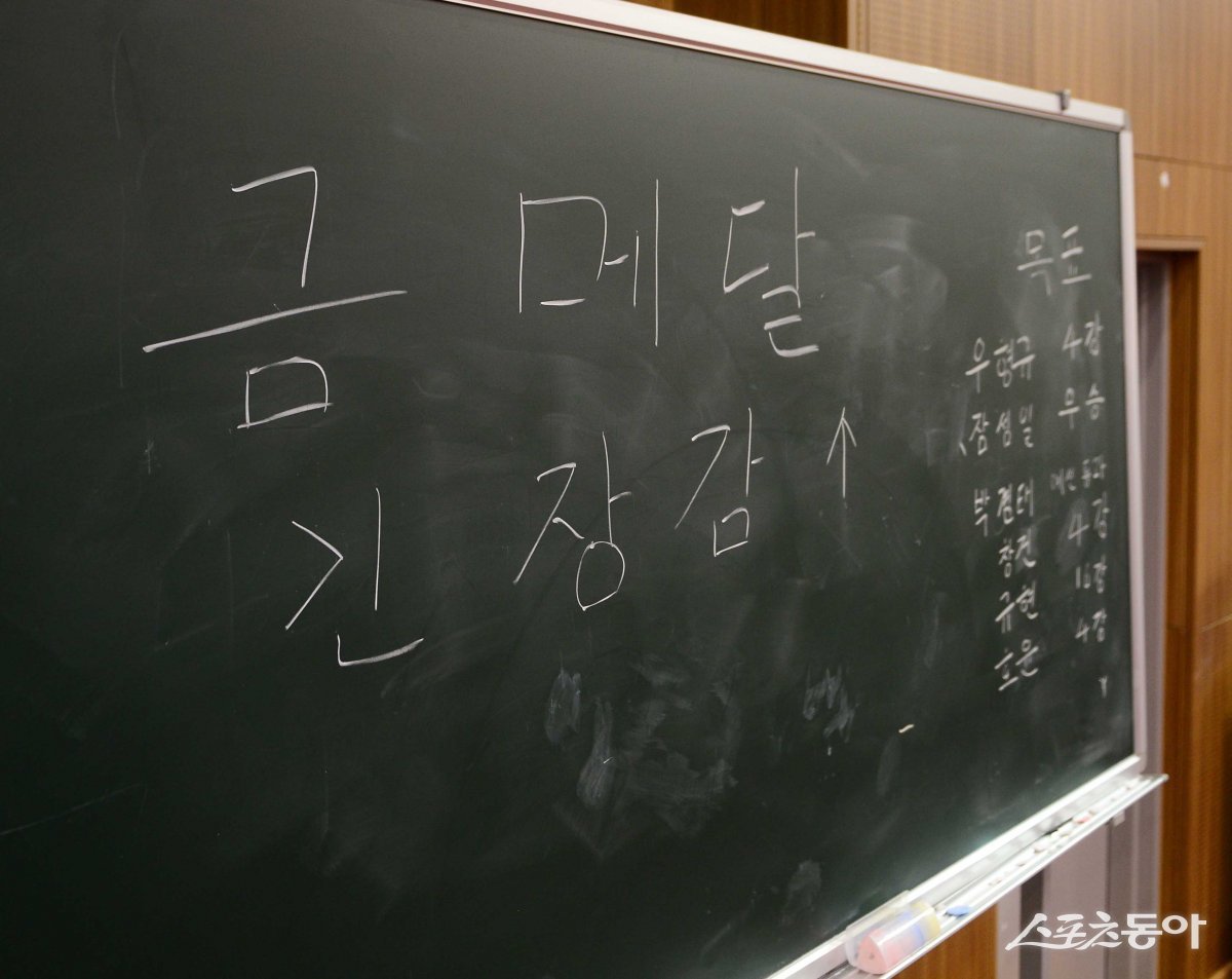 한국탁구대표팀이 24일 충북 진천국가대표선수촌에서 열린 ‘2022 항저우아시아경기대회 D-30 미디어데이’에서 훈련장 칠판에 문구를 적어넣고 있다.