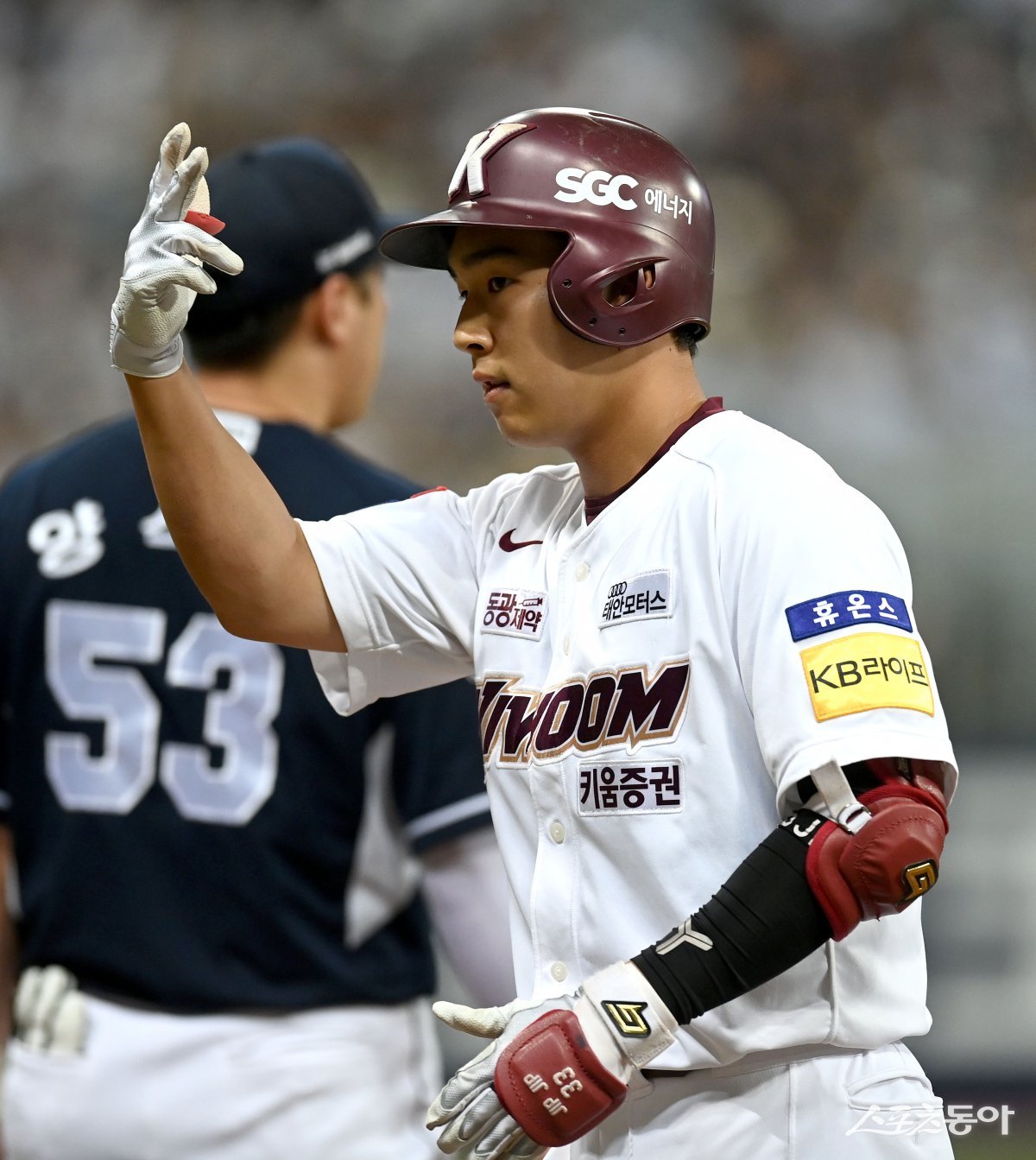 24일 서울 고척스카이돔에서 ‘2023 신한은행 SOL KBO리그’ 두산 베어스와 키움 히어로즈 경기가 열렸다. 2회말 2사 1,3루 키움 김휘집이 1타점 적시타를 치고 1루에서 기뻐하고 있다.