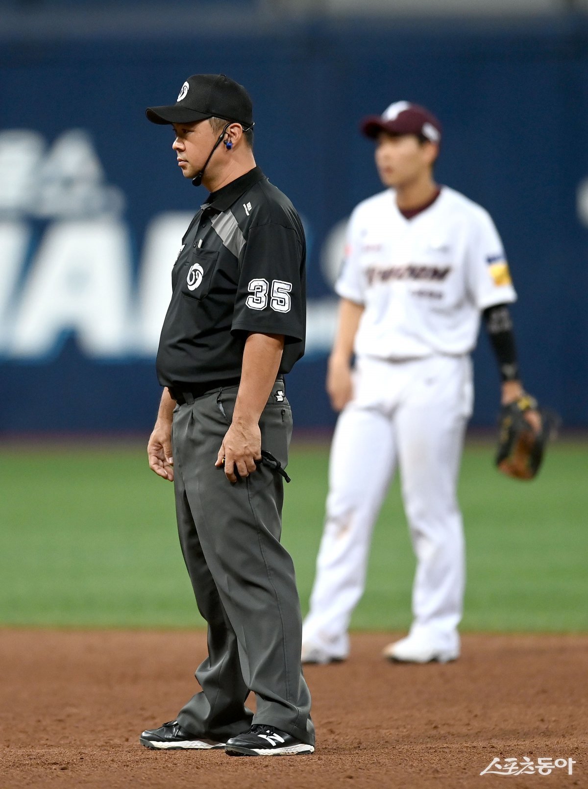 24일 서울 고척스카이돔에서 ‘2023 신한은행 SOL KBO리그’ 두산 베어스와 키움 히어로즈 경기가 열렸다. 비디오 판독시 판독 내용을 전달받을 수 있는 심판 무선 언터컴을 윤태수 심판이 착용하고 있다.