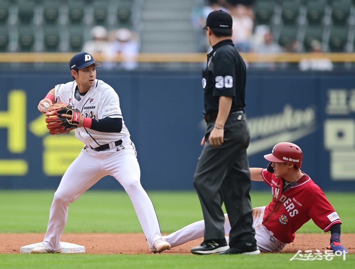 27일 서울 잠실야구장에서 열린 ‘2023 신한은행 SOL KBO리그’ 두산 베어스와 SSG 랜더스의 경기에서 1회초 무사 1루 SSG의 내야 땅볼 때 두산 강승호가 1루주자 최지훈을 포스 아웃시킨 후 1루로 송구하고 있다.