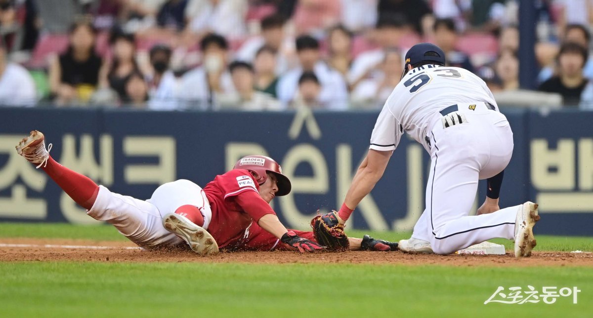 27일 서울 잠실야구장에서 열린 ‘2023 신한은행 SOL KBO리그’ 두산 베어스와 SSG 랜더스의 경기에서 4회초 1사 1루 상황에서 SSG 박성한이 두산 투수의 견제구에 태그 아웃당하고 있다.