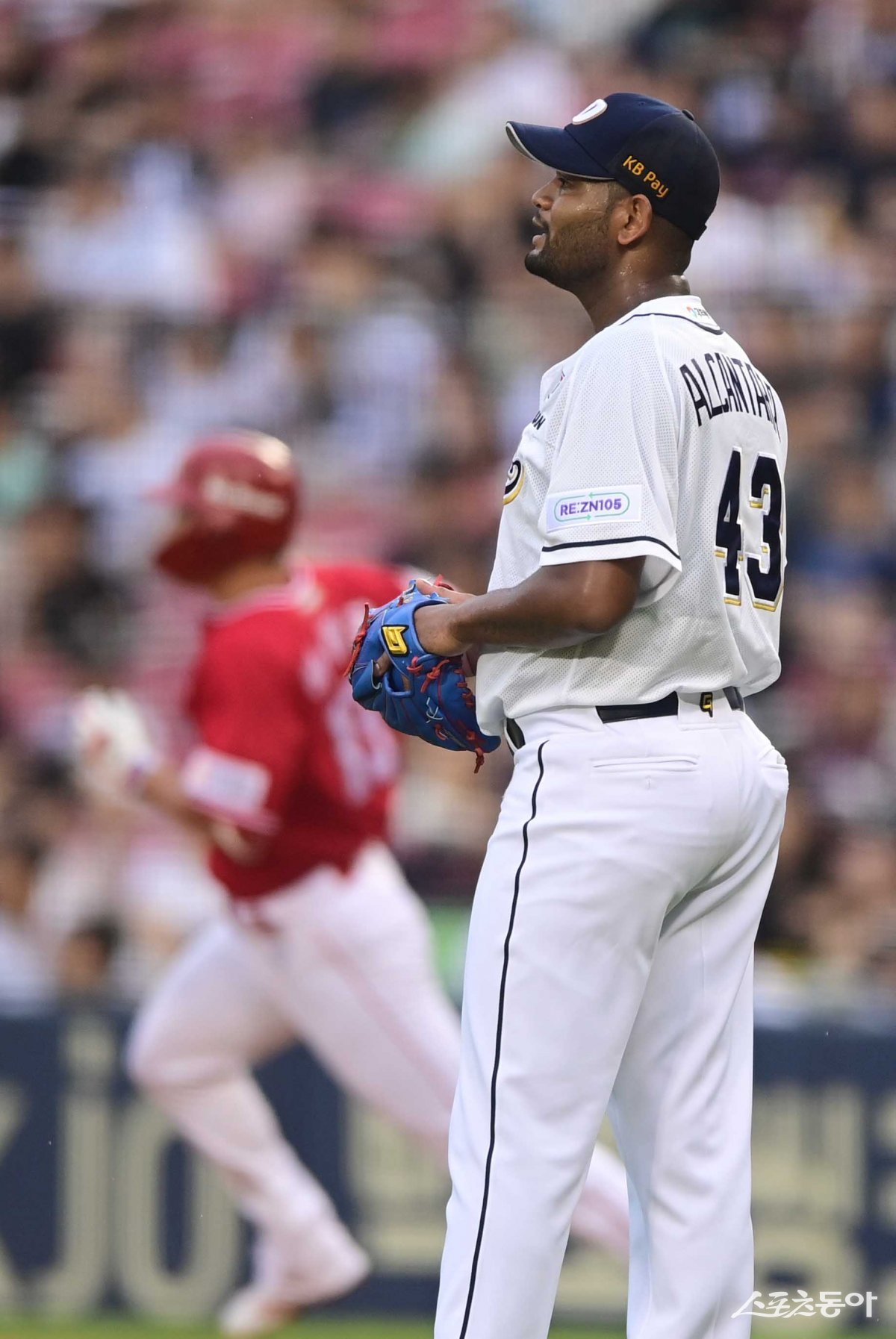 27일 서울 잠실야구장에서 열린 ‘2023 신한은행 SOL KBO리그’ 두산 베어스와 SSG 랜더스의 경기에서 4회초 2사 2루 SSG에 투런 홈런을 허용한 두산 알칸타라가 아쉬워하고 있다.