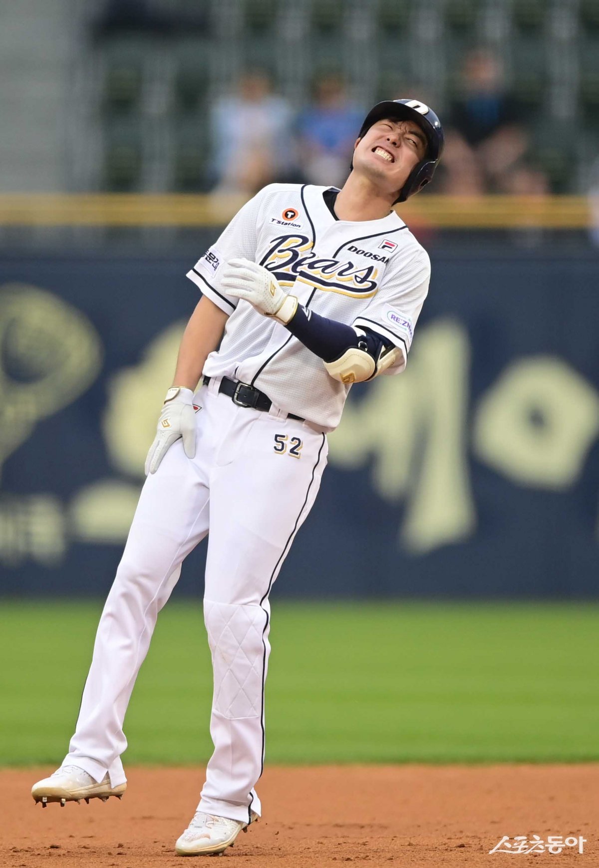 27일 서울 잠실야구장에서 열린 ‘2023 신한은행 SOL KBO리그’ 두산 베어스와 SSG 랜더스의 경기에서 3회말 무사 1루 두산 김재호가 우전 2루타를 친 후 다리를 잡고 통증을 호소하고 있다.