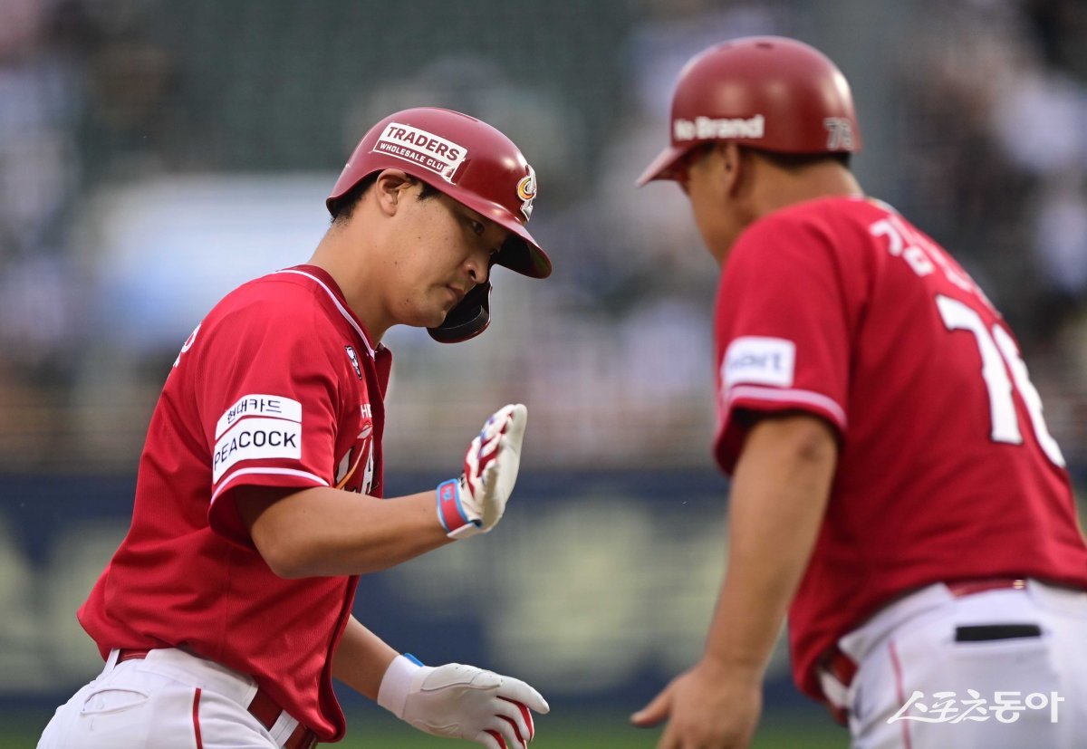 27일 서울 잠실야구장에서 열린 ‘2023 신한은행 SOL KBO리그’ 두산 베어스와 SSG 랜더스의 경기에서 4회초 2사 2루 SSG 하재훈이 좌월 투런 홈런을 친 후 3루코치와 기쁨을 나누고 있다.