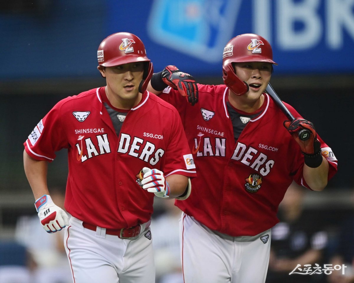 27일 서울 잠실야구장에서 열린 ‘2023 신한은행 SOL KBO리그’ 두산 베어스와 SSG 랜더스의 경기에서 4회초 2사 2루 SSG 하재훈이 좌월 투런 홈런을 친 후 2루주자 전의산과 기쁨을 나누고 있다.