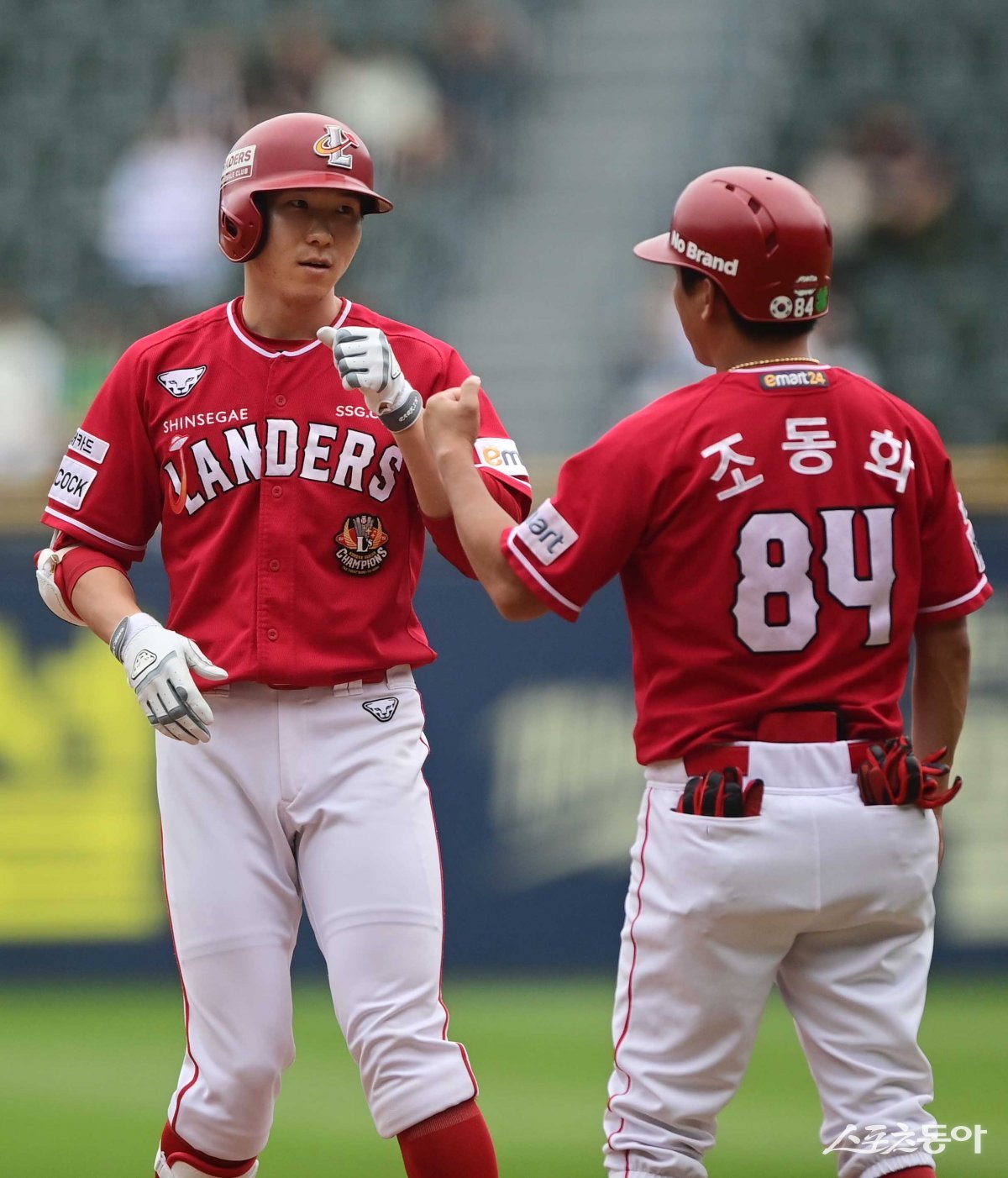 27일 서울 잠실야구장에서 열린 ‘2023 신한은행 SOL KBO리그’ 두산 베어스와 SSG 랜더스의 경기에서 1회초 2사 2루 SSG 박성한이 좌전 적시타를 친 후 1루코치와 주먹을 맞대고 있다.