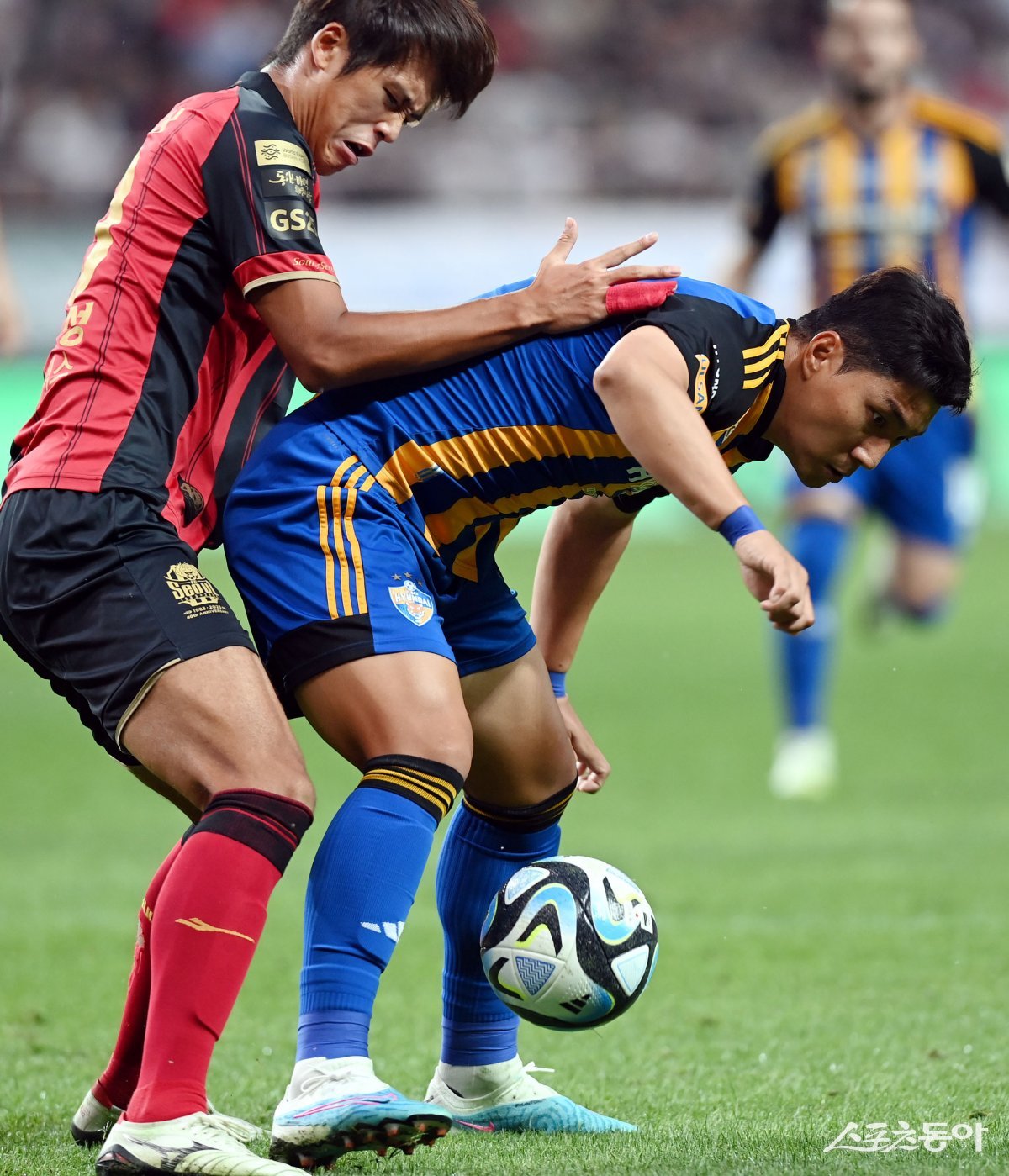 27일 서울 월드컵경기장에서 열린 ‘하나원큐 K리그1 2023’ FC 서울과 울산 현대의 경기에서 울산 주민규와 서울 김주성이 볼 다툼을 벌이고 있다.