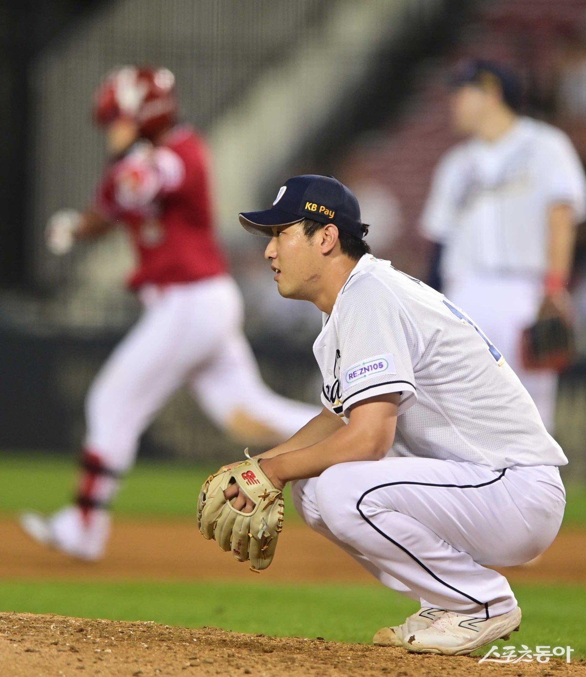 27일 서울 잠실야구장에서 열린 ‘2023 신한은행 SOL KBO리그’ 두산 베어스와 SSG 랜더스의 경기에서 8회초 무사 SSG에 솔로포를 허용한 두산 홍건희가 아쉬워하고 있다.