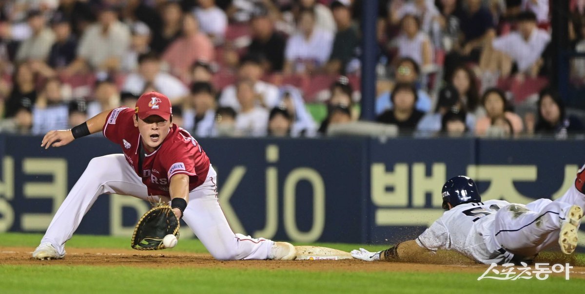 27일 서울 잠실야구장에서 열린 ‘2023 신한은행 SOL KBO리그’ 두산 베어스와 SSG 랜더스의 경기에서 6회말 2사 두산의 내야 안타 때 SSG 1루수 전의산이 송구된 볼을 잡고 있다.