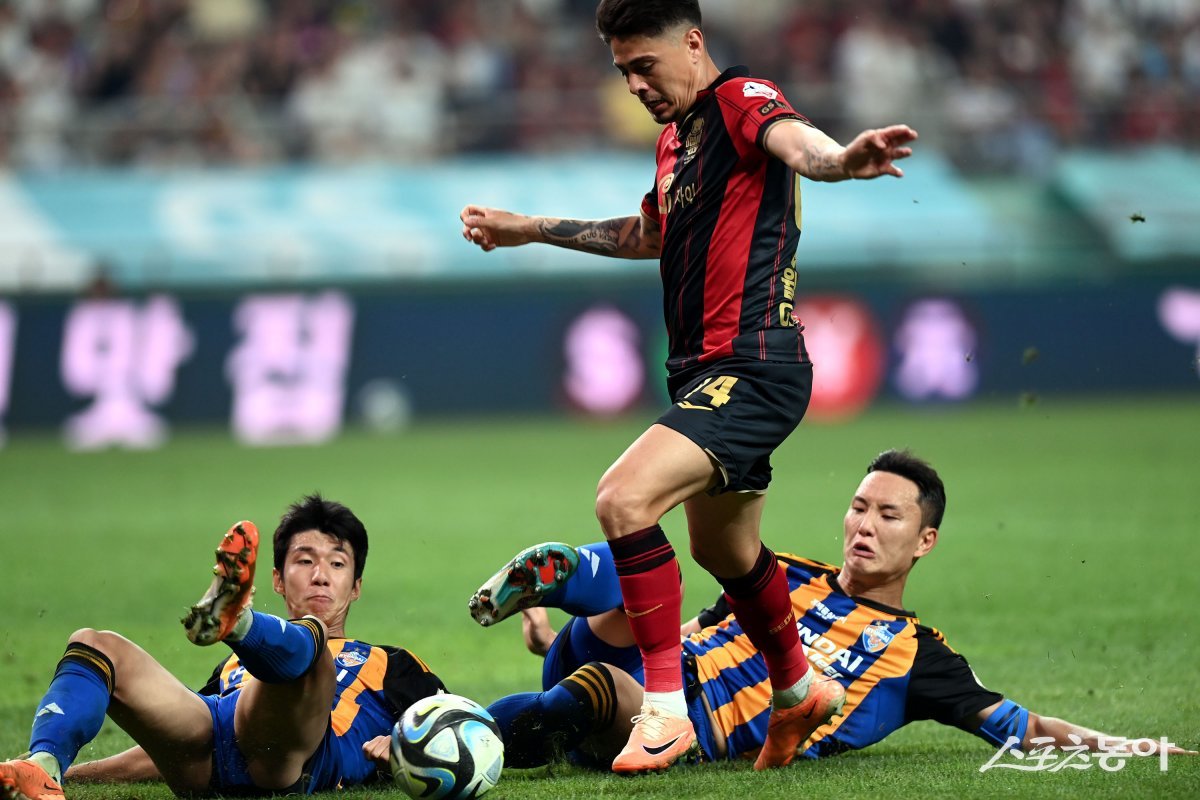 27일 서울 월드컵경기장에서 열린 ‘하나원큐 K리그1 2023’ FC 서울과 울산 현대의 경기에서 서울 윌리안이 울산 수비를 제치며 돌파를 시도하고 있다.