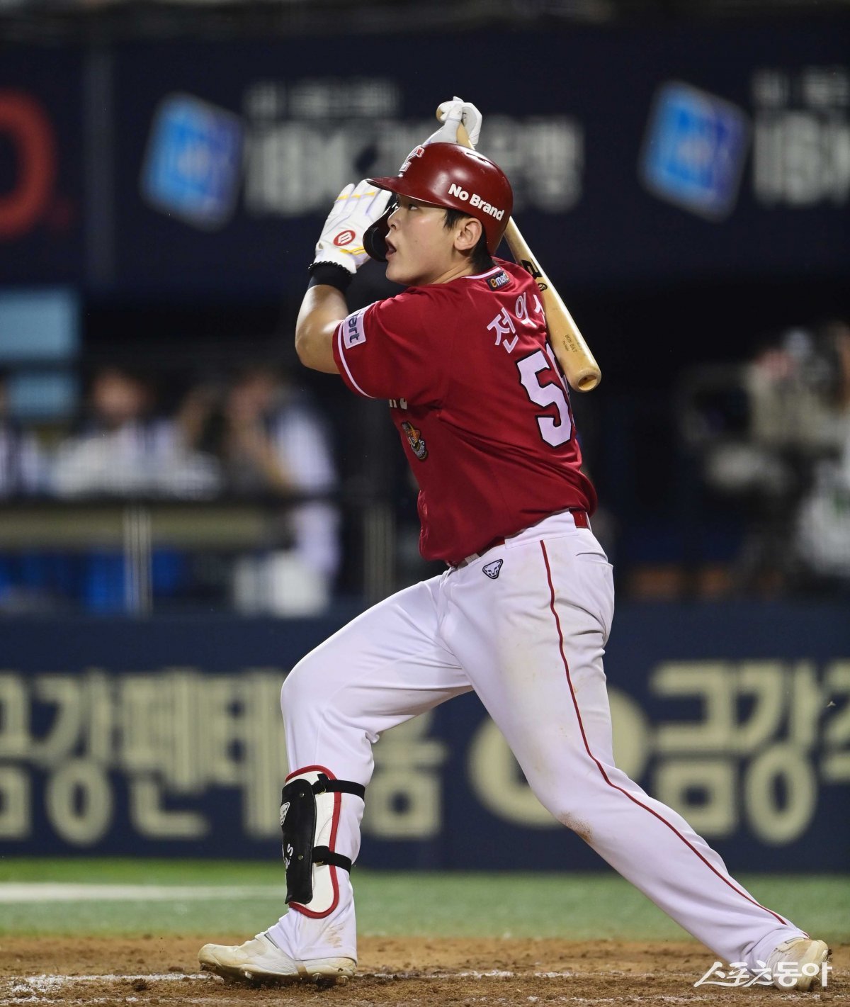 27일 서울 잠실야구장에서 열린 ‘2023 신한은행 SOL KBO리그’ 두산 베어스와 SSG 랜더스의 경기에서 연장 10회초 2사 3루 SSG 전의산이 1타점 좌전 적시타를 치고 있다.