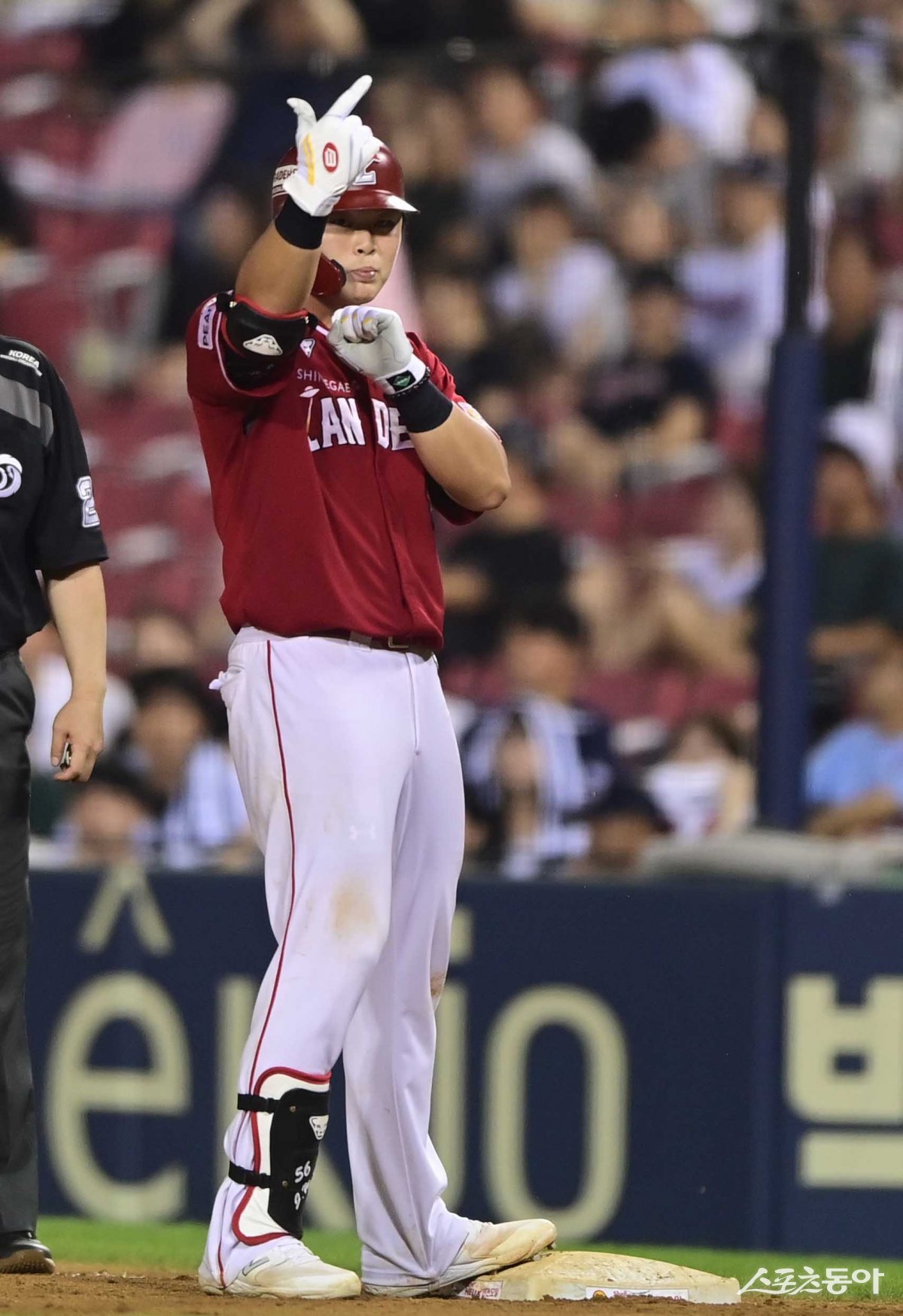 27일 서울 잠실야구장에서 열린 ‘2023 신한은행 SOL KBO리그’ 두산 베어스와 SSG 랜더스의 경기에서 연장 10회초 2사 3루 SSG 전의산이 1타점 좌전 적시타를 친 후 세리머니를 하고 있다.