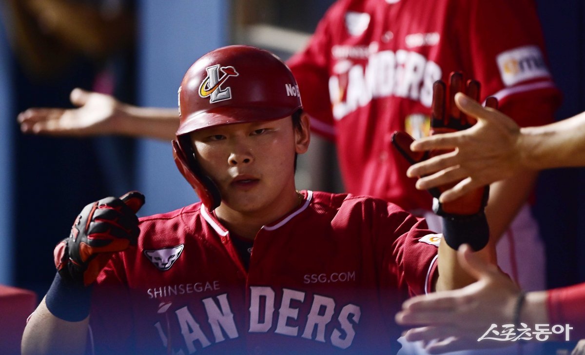 27일 서울 잠실야구장에서 열린 ‘2023 신한은행 SOL KBO리그’ 두산 베어스와 SSG 랜더스의 경기에서 연장 10회초 2사 2, 3루 SSG의 중전 적시타 때 득점에 성공한 SSG 전의산이 더그아웃에서 동료들과 기쁨을 나누고 있다.