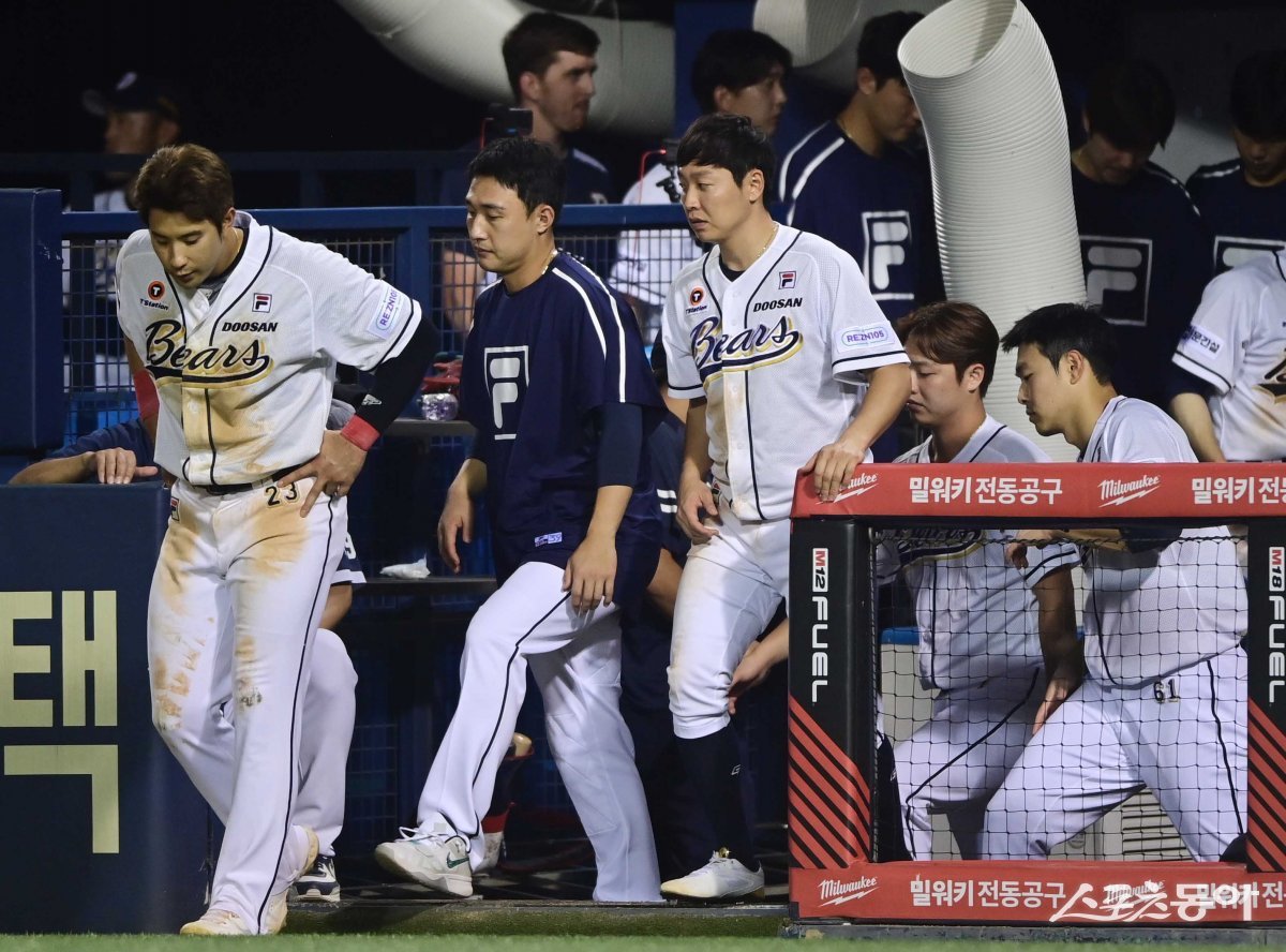 27일 서울 잠실야구장에서 열린 ‘2023 신한은행 SOL KBO리그’ 두산 베어스와 SSG 랜더스의 경기에서 5-8로 패한 두산 선수들이 아쉬워하고 있다.