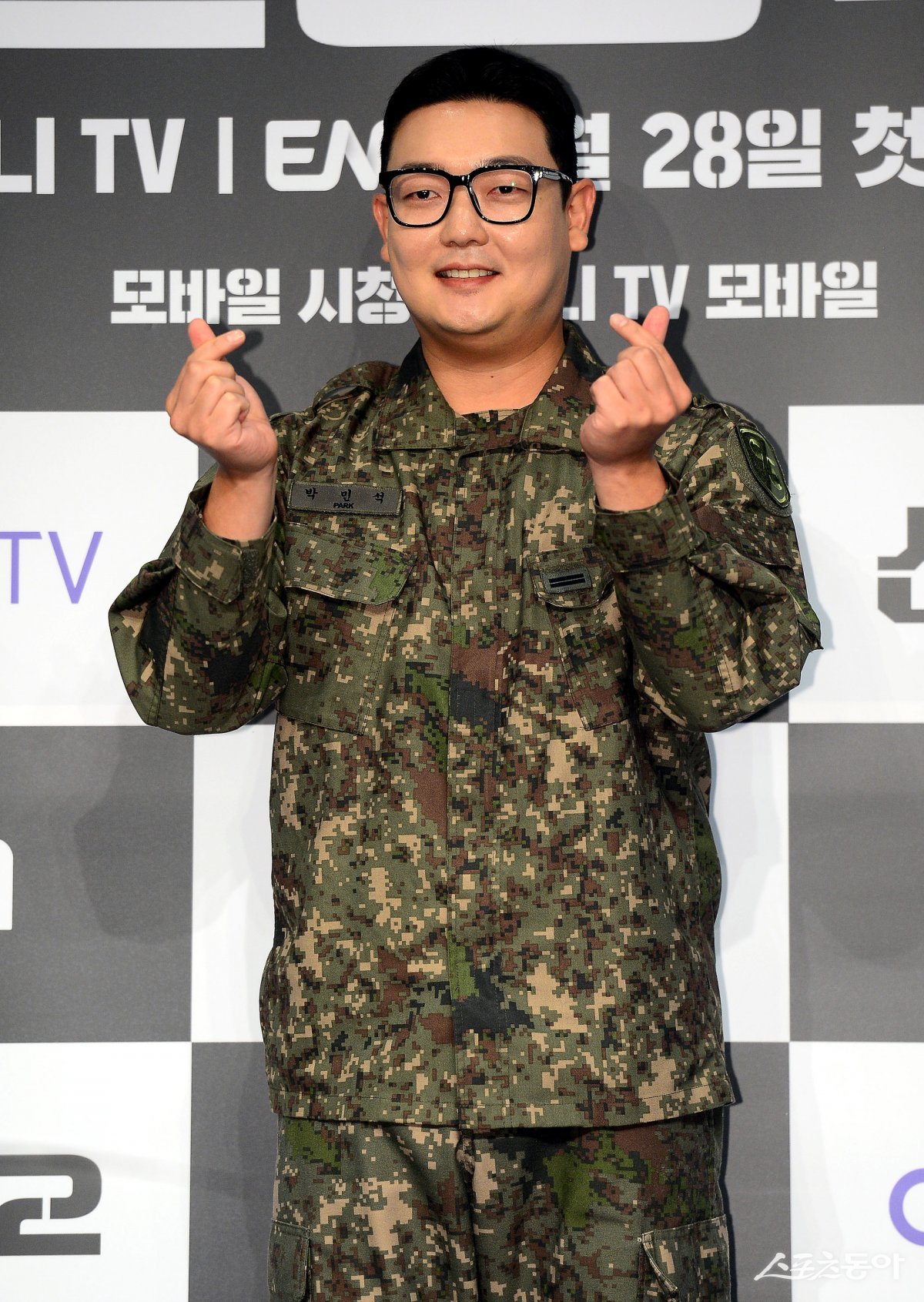 28일 서울 신도림 디큐브시티 더세인트에서 지니TV 오리지널 드라마 ‘신병2’ 제작발표회에 참석한 배우 김민호가 카메라를 향해 포즈를 취하고 있다.