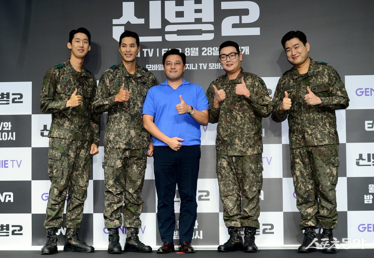 28일 서울 신도림 디큐브시티 더세인트에서 지니TV 오리지널 드라마 ‘신병2’ 제작발표회에 참석한 배우 이상진, 김지석, 민진기 감독, 김민호, 남태우가 카메라를 향해 포즈를 취하고 있다.