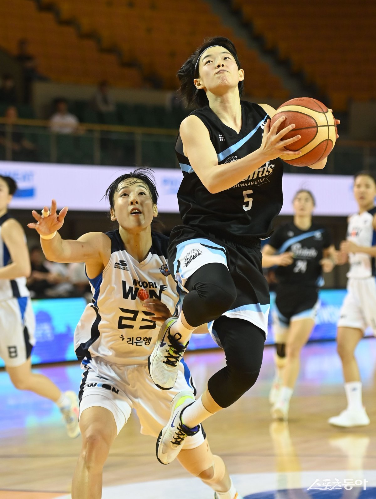 28일 청주체육관에서 열린 2023 박신자컵 국제대회 우리은행과 신한은행 경기에서 신한은행 강계리가 우리은행 김단비의 수비를 뚫고 골밑 슛을 하고 있다.