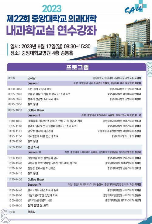중앙대병원은 9월17일 ‘제22회 중앙의대 내과학교실 개원의 연수강좌’를 개최한다.개원 의사, 전공의 등을 대상으로 하는 이번 연수강좌는 총 4개 세션으로 내과 분과의 여러 질환의 증상, 검사, 진단과 치료에 대하여 증례 중심으로 강좌 프로그램을 진행한다.