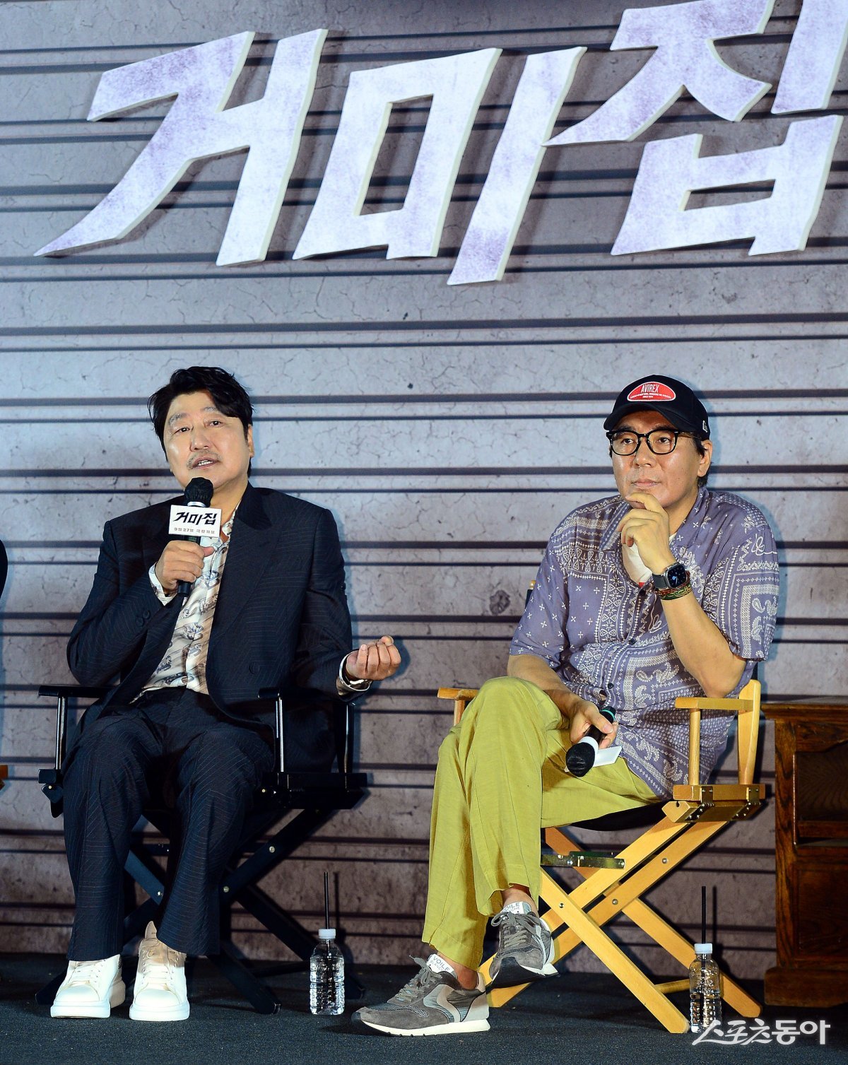 29일 서울 용산구 CGV 용산아이파크몰에서 열린 영화 ‘거미집’ 제작보고회에 참석한 배우 송강호와 김지운 감독이 인터뷰를 하고 있다.