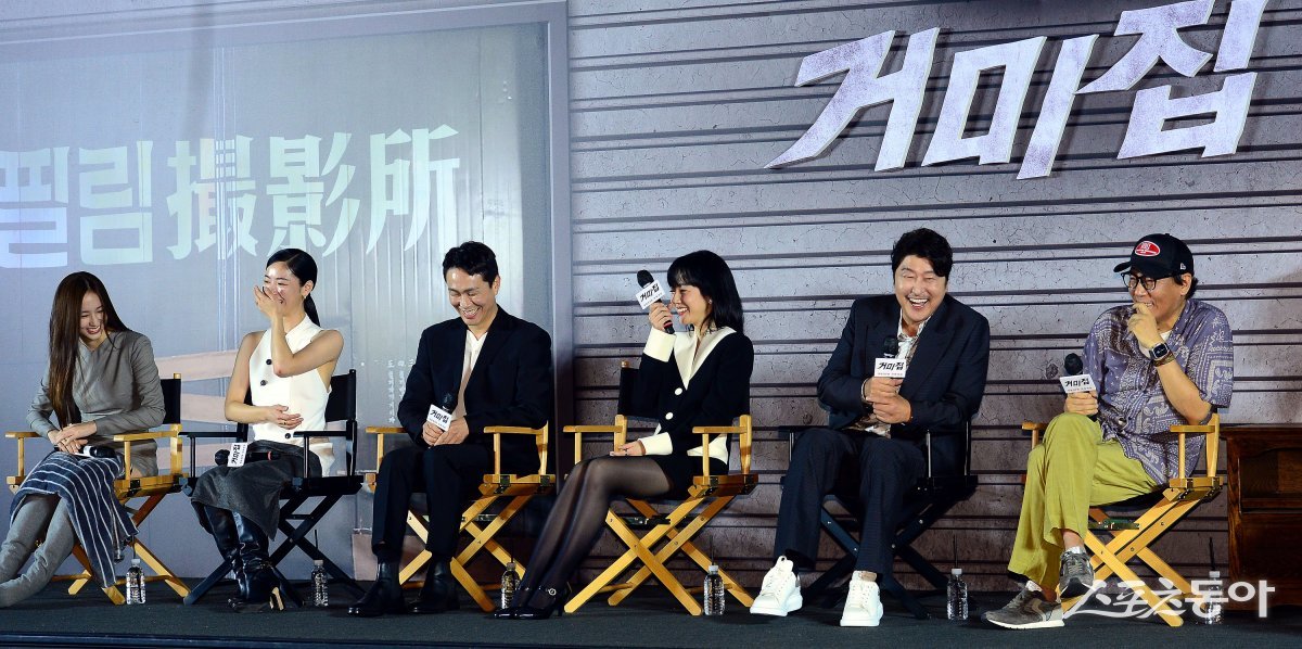 29일 서울 용산구 CGV 용산아이파크몰에서 열린 영화 ‘거미집’ 제작보고회에 참석한 배우들이 화기애애한 분위기를 연출하고 있다.