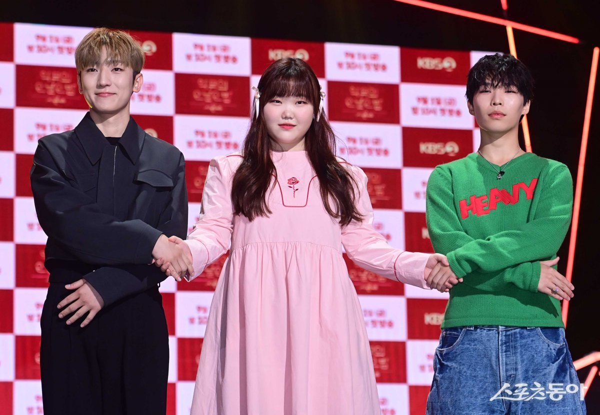 멜로망스 정동환, 악뮤 이수현, 이찬혁이 29일 서울 영등포구 여의도동 KBS신관 아트홀에서 열린 KBS 2TV 뮤직 토크쇼 ‘더 시즌즈-악뮤의 오날오밤’ 제작발표회에서 포즈를 취하고 있다.