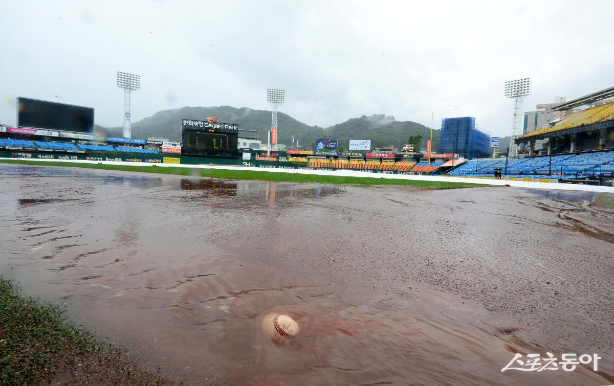 29일 대전 한화생명이글스파크에서 ‘2023 신한은행 SOL KBO리그’ 롯데 자이언츠와 한화 이글스 경기가 열린다. 우천으로 그라운드에 젖어 있다.