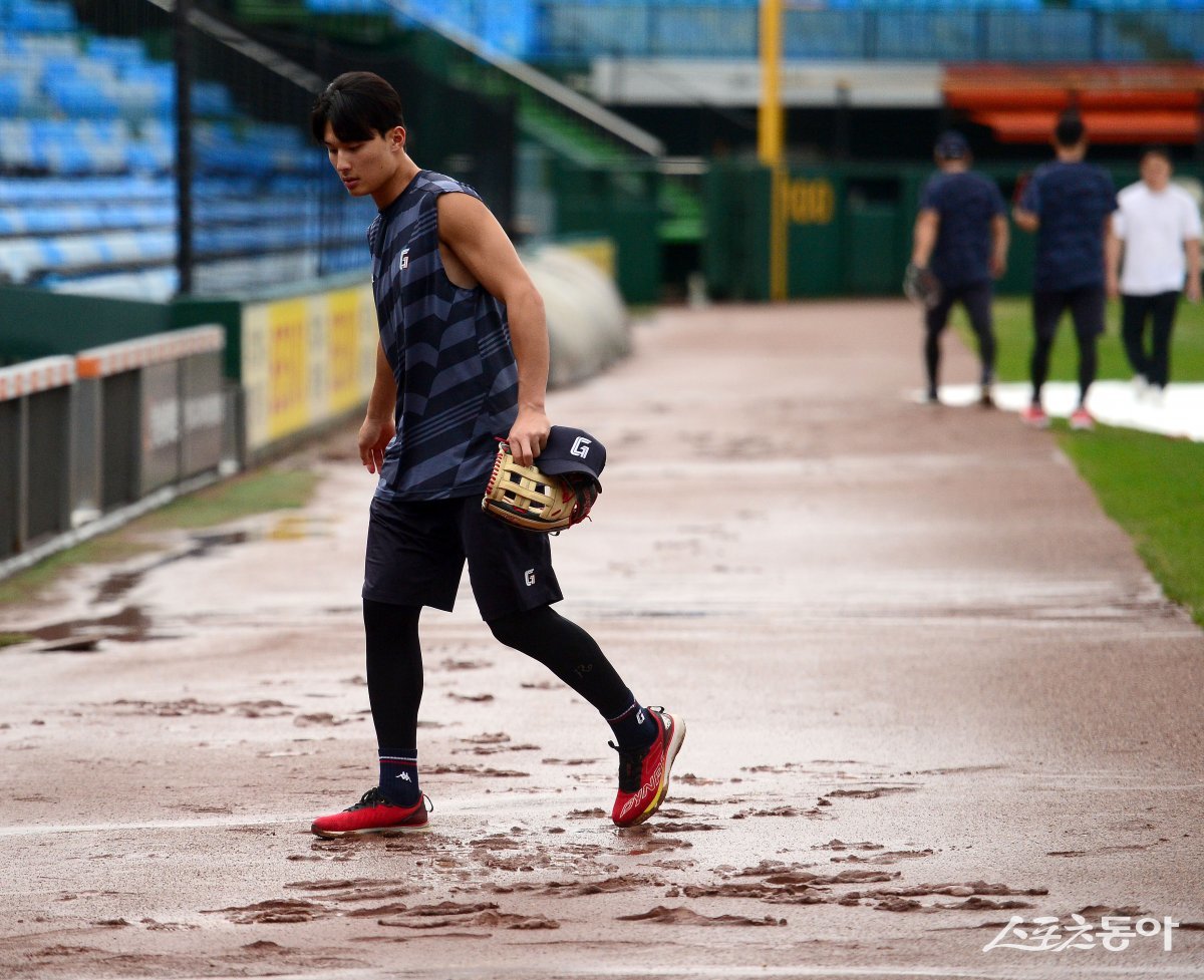 29일 대전 한화생명이글스파크에서 ‘2023 신한은행 SOL KBO리그’ 롯데 자이언츠와 한화 이글스 경기가 열린다. 롯대 윤동희가 젖은 그라운드를 이동하고 있다.