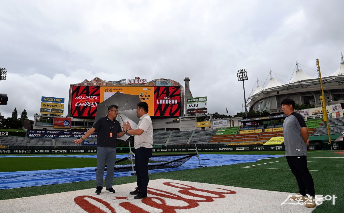29일 인천 SSG 랜더스필드에서 열릴예정인 ‘2023 신한은행 SOL KBO리그’ SSG 랜더스와 키움 히어로즈의 경기가 우천으로 인해 취소되었다. 박종훈 감독관이 야구장 관계자들과 그라운드 상태를 이야기하고 있다.