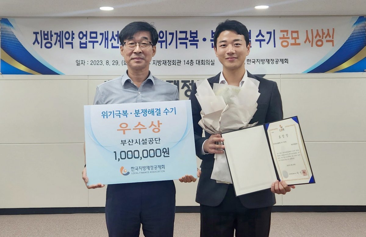 부산시설공단(이사장 직무대행 김훈식)이 29일 한국지방재정공제회에서 개최된 지방계약 업무개선 사례·분쟁 해결 수기 공모 시상식에서 우수상을 수상했다.행정안전부 산하 한국지방재정공제회(이사장 이인재)가 주최한 이번 공모는 지난 3월 30일~6월 30일 전국 지자체·공사·공단 등 전·현직 실무자들이 대거 참여했고 2단계 심사를 거쳐 업무개선사례 6건과 분쟁 해결 수기 4건 등 최종 10건이 수상작으로 선정됐다.
