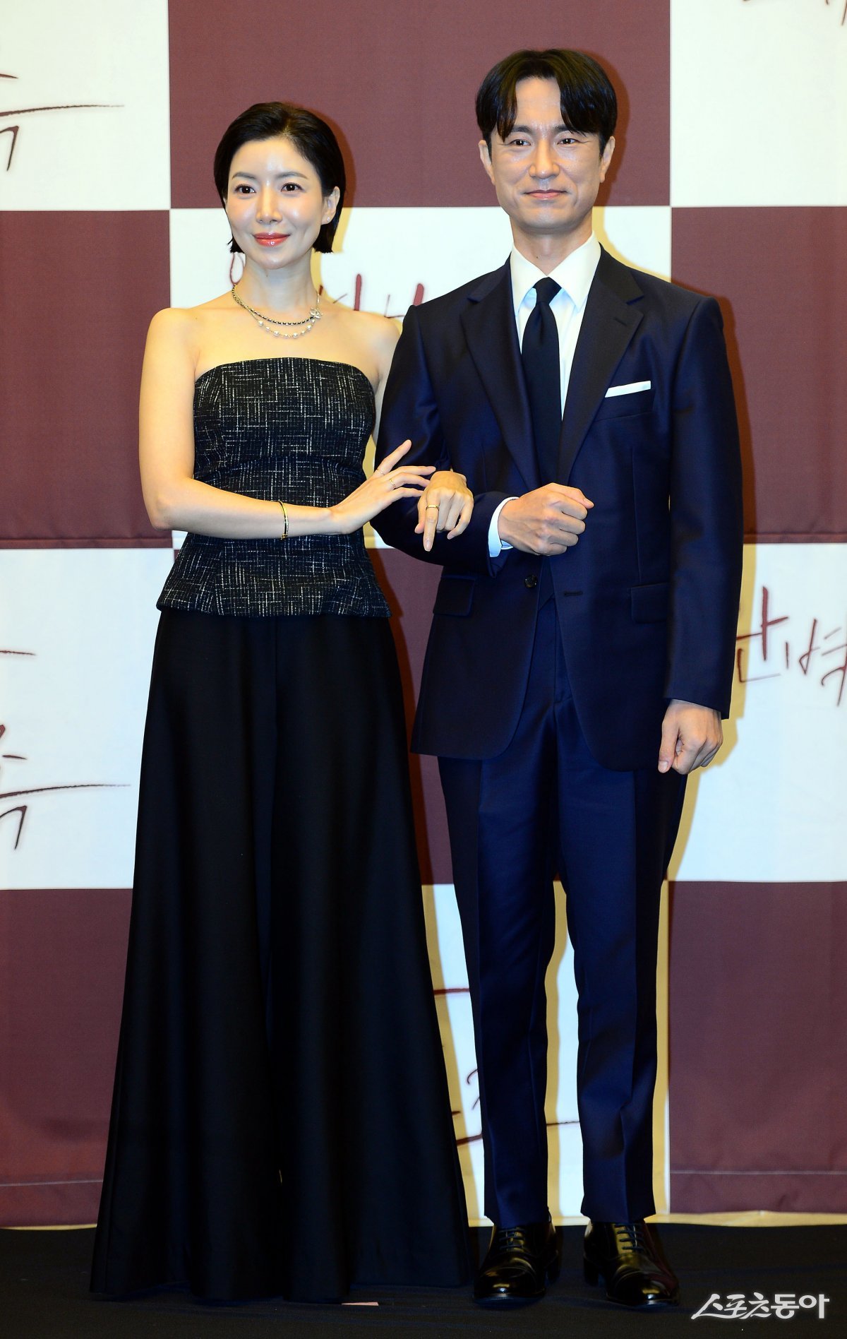 31일 서울 상암동 스탠포드호텔에서 열린 드라마 ‘완벽한 가족’ 기자간담회에 참석한 배우 윤세아와 김병철이 카메라를 향해 포즈를 취하고 있다.