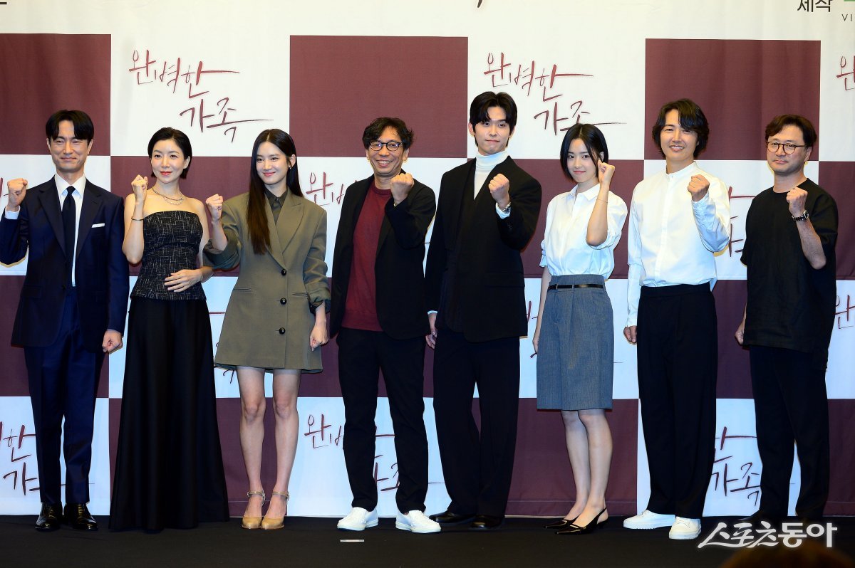 31일 서울 상암동 스탠포드호텔에서 열린 드라마 ‘완벽한 가족’ 기자간담회에 참석한 배우 김병철, 윤세아, 박주현, 유키사다 이사오 감독, 이시우, 최예빈, 윤상현, 서주완 PD가 카메라를 향해 포즈를 취하고 있다.