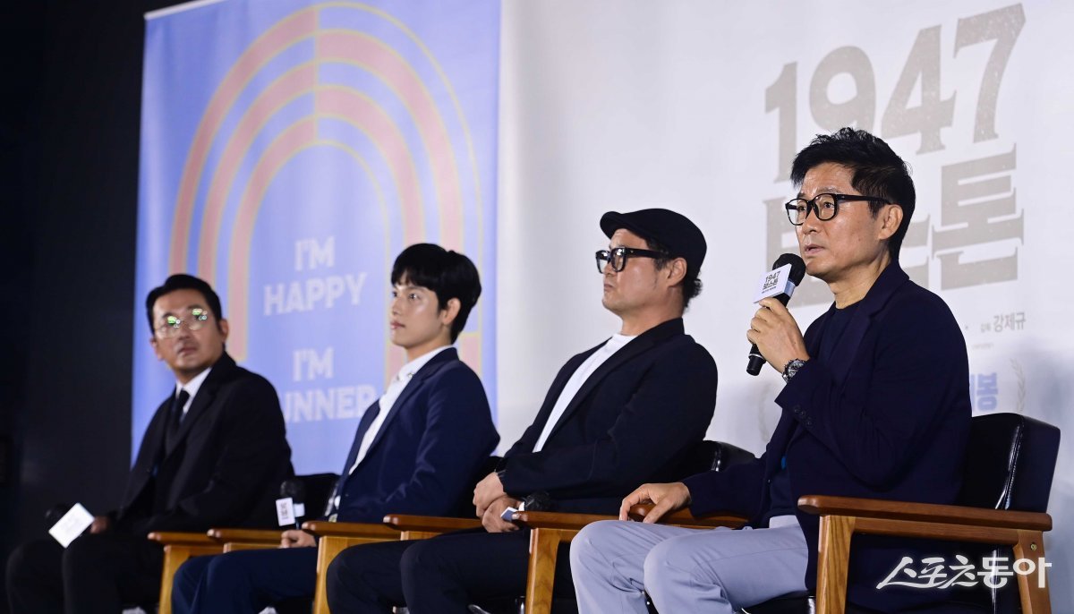 감독 강제규가 31일 서울 광진구 자양동 롯데시네마 건대입구점에서 열린 영화 ‘1947 보스턴’ 제작보고회에서 MC의 질문에 답하고 있다.