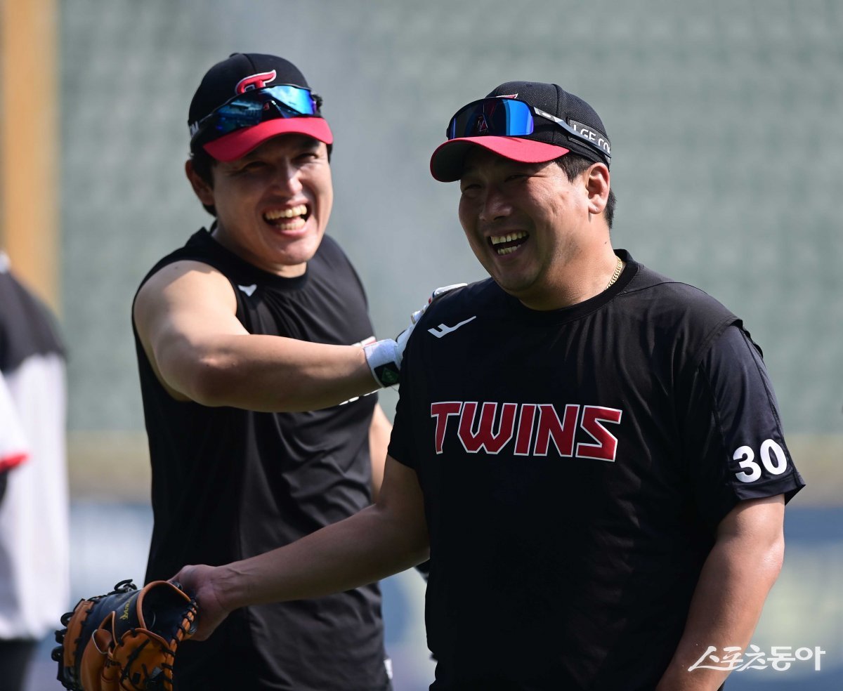 31일 서울 잠실야구장에서 열린 ‘2023 신한은행 SOL KBO리그’ LG 트윈스와 두산 베어스의 경기에 앞서 LG 박동원과 허도환이 장난을 치며 웃고 있다.