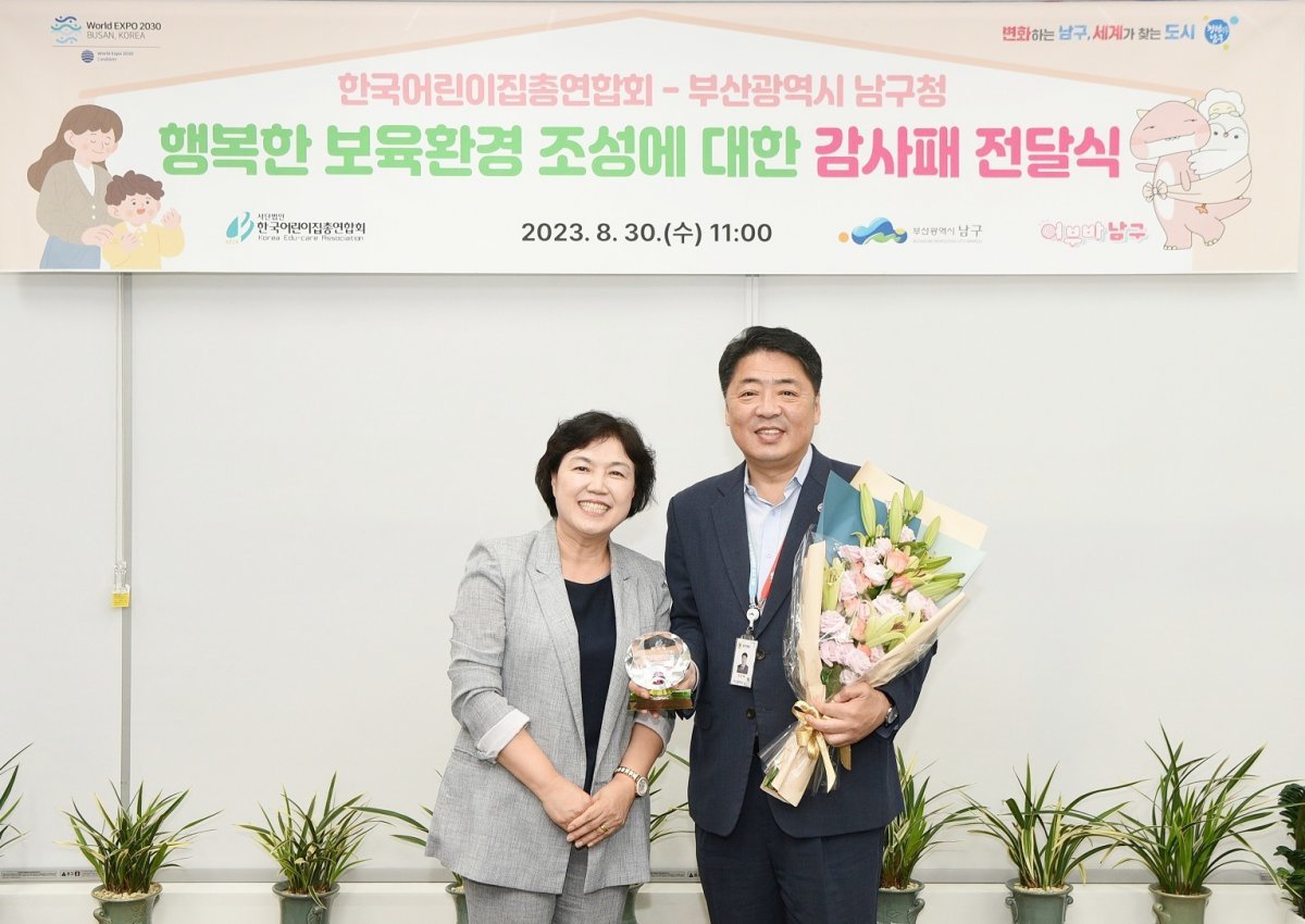 부산 남구(구청장 오은택)가 지난 30일 전국 지방자치단체 최초로 한국어린이집총연합회(한어총, 회장 김경숙)로부터 감사패를 받았다.김경숙 회장은 어린이집 행정업무 지원·컨설팅 교육을 위해 전국 최초로 도입한 ▲보육 행정전문가 채용(시간선택제임기제) ▲대체 조리사 지원 ▲안전공제회비 지원 등 ‘어부바 남구(어린이와 부모가 바라는 남구)’의 보육환경 조성에 기여한 공로로 구에 감사패를 전달했다.