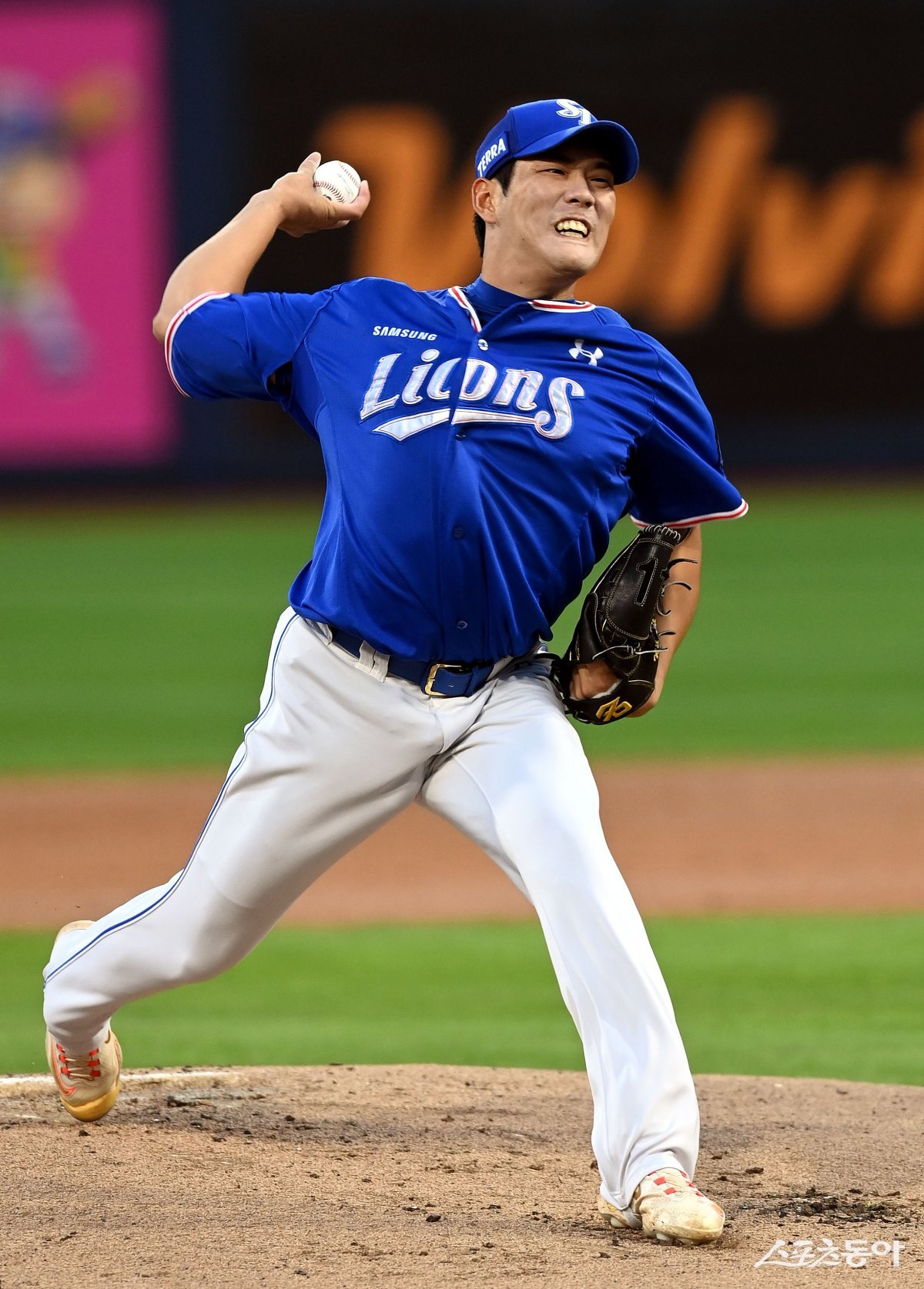 31일 경기도 수원 kt위즈파크에서 ‘2023 신한은행 SOL KBO리그’ kt 위즈와 삼성 라이온즈의 경기가 열렸다. 삼성 선발투수 홍정우가 힘차게 볼을 던지고 있다.