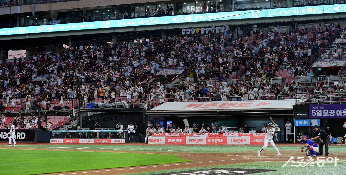 31일 경기도 수원 kt위즈파크에서 ‘2023 신한은행 SOL KBO리그’ kt 위즈와 삼성 라이온즈의 경기가 열렸다. 600만 관중 돌파를 눈앞에 두고 야구팬들이 응원을 펼치고 있다.