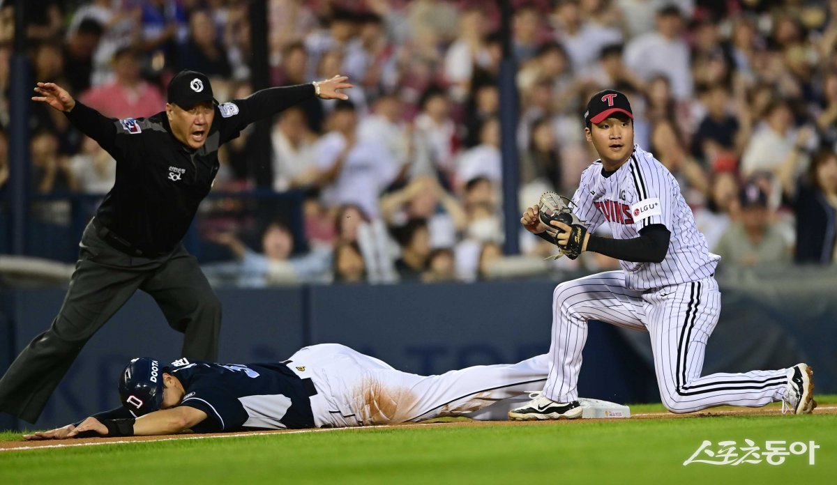 31일 서울 잠실야구장에서 열린 ‘2023 신한은행 SOL KBO리그’ LG 트윈스와 두산 베어스의 경기에서 2회초 2사 1, 2루 두산의 내야 안타 때 LG 3루수 문보경이 두산 2루주자에게 진루를 허용한 후 타자 주자를 바라보고 있다.
