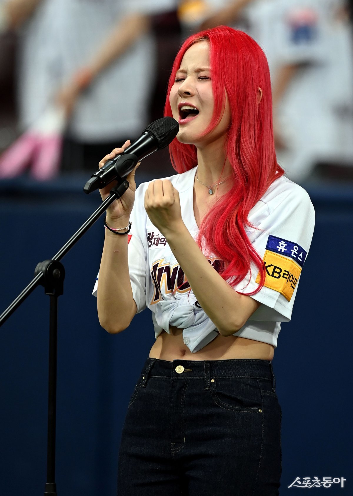 3일 서울 고척스카이돔에서 ‘2023 신한은행 SOL KBO리그’ 키움 히어로즈와 kt 위즈의 경기가 열렸다. 걸그룹 키스오브라이프 벨이 애국가를 부르고 있다.