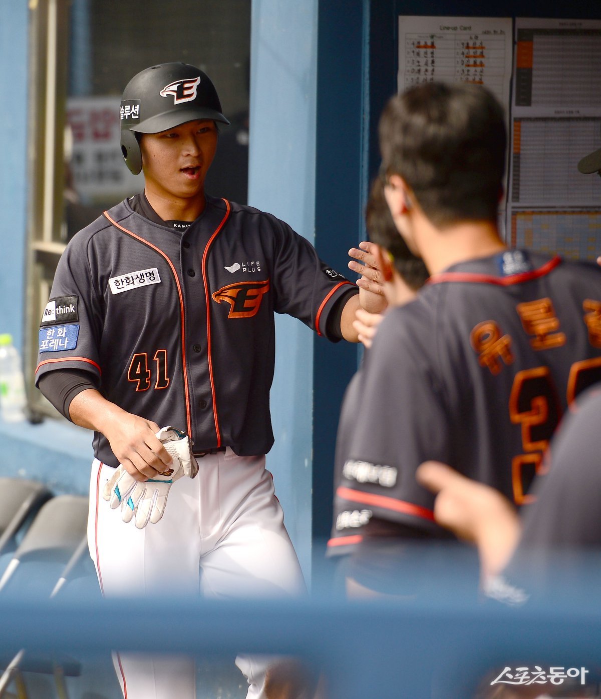3일 서울 잠실야구장에서 ‘2023 신한은행 SOL KBO리그’ 한화 이글스와 LG 트윈스 경기가 열렸다. 2회초 무사 3루 한화 내야 땅볼 때 득점한 최인호가 하이파이브 하고 있다.