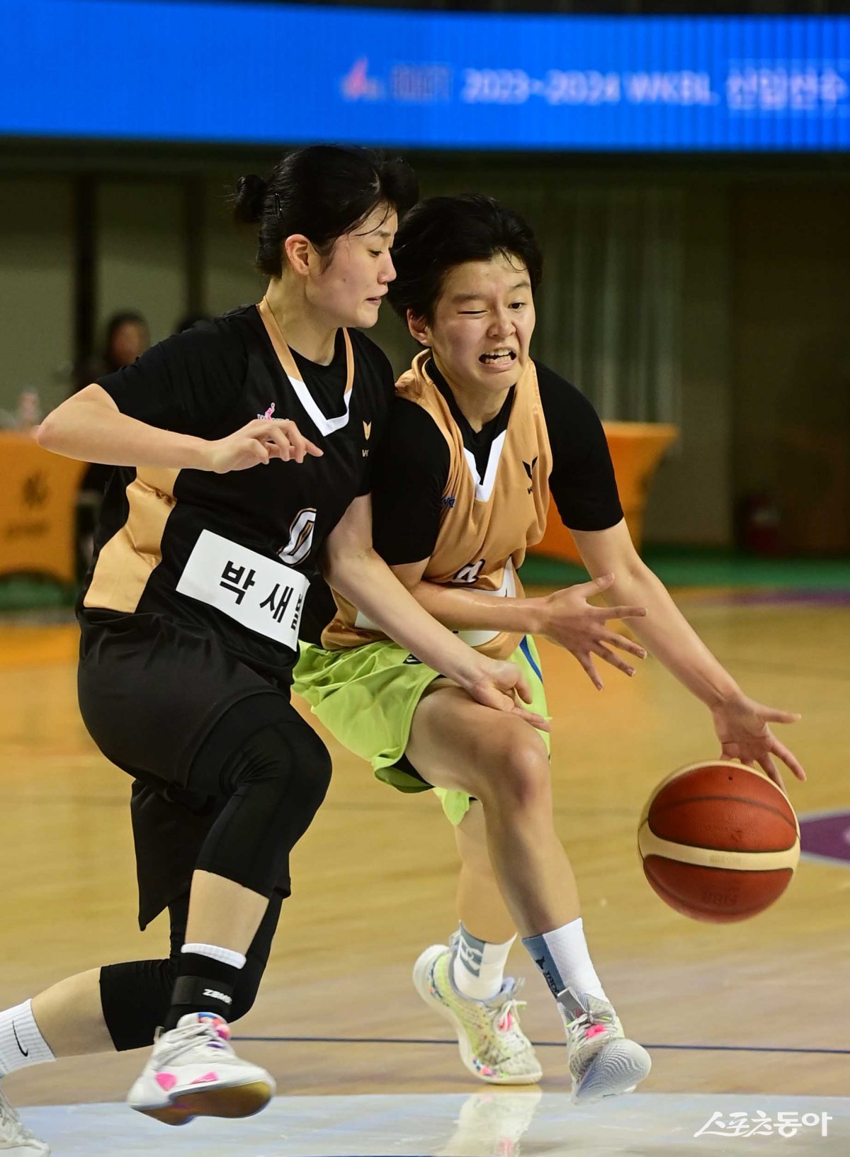 4일 충북 청주실내체육관에서 열린 ‘2023-2024 WKBL 드래프트 신입선수 선발회’ 트라이아웃에서 춘천여고 성수연이 드리블 돌파를 하고 있다.