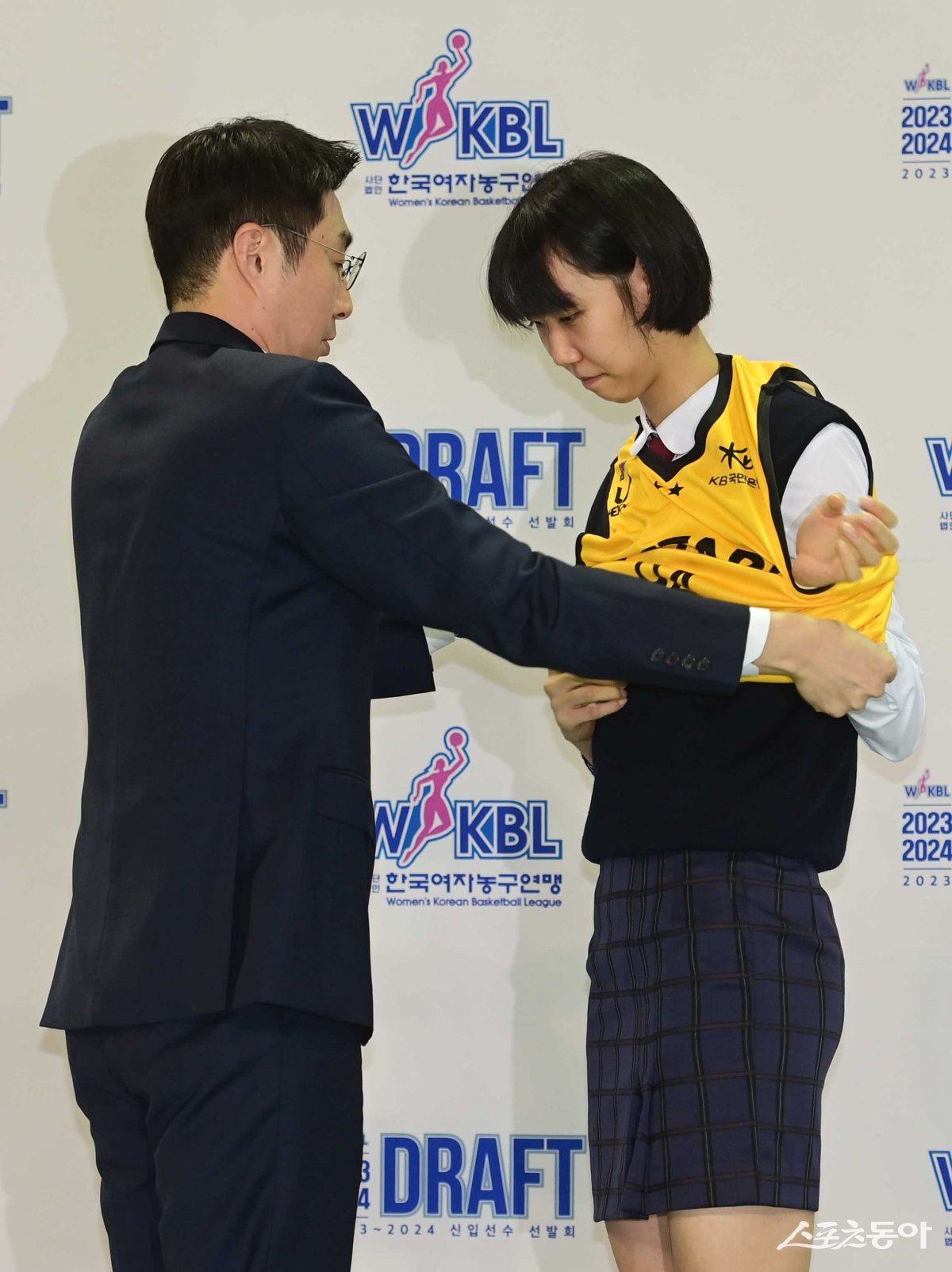 4일 충북 청주실내체육관에서 열린 ‘2023-2024 WKBL 드래프트 신입선수 선발회’ 선수 지명식에서 1라운드 1순위로 KB에 지명된 고현지가 김완수 감독으로부터 유니폼을 받아 입고 있다.