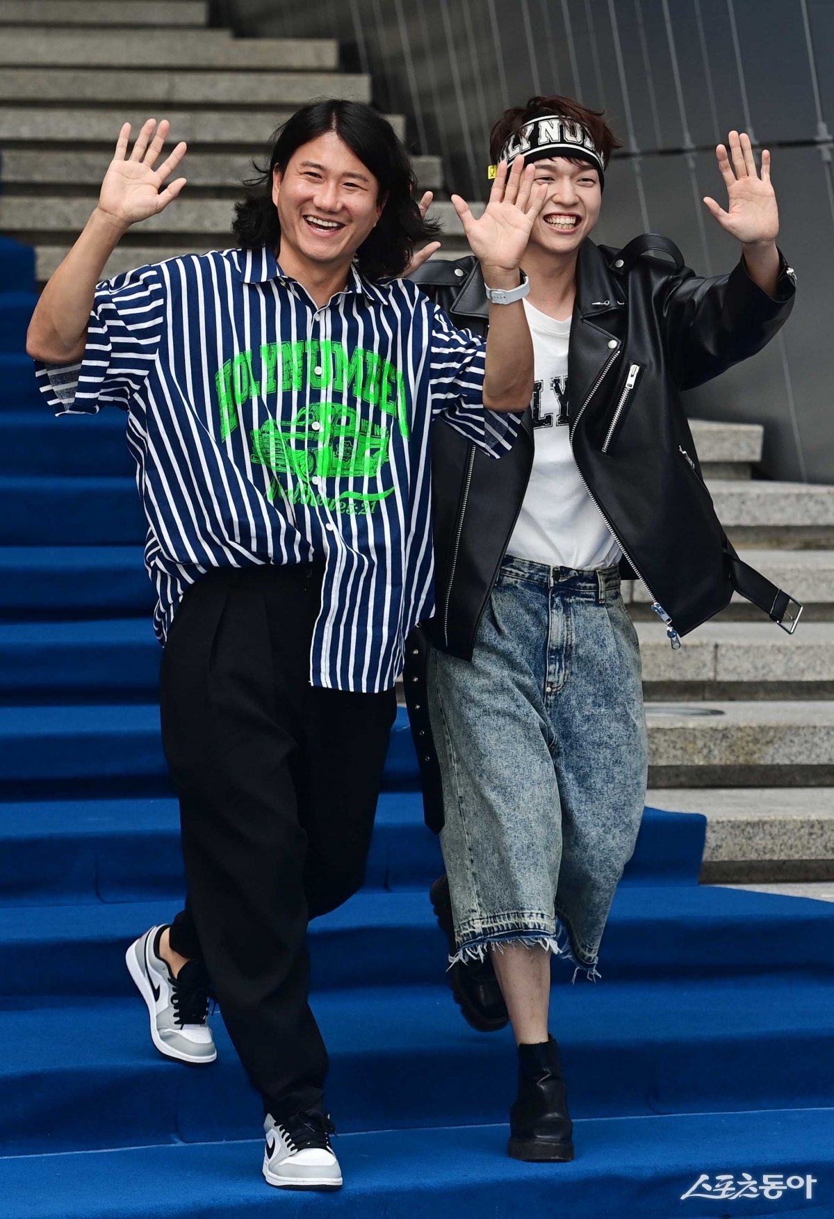 개그맨 임우일, 유재필이 5일 서울 중구 동대문디자인플라자(DDP)에서 열린 ‘2024 S/S 서울패션위크’ 포토월에 입장하고 있다.