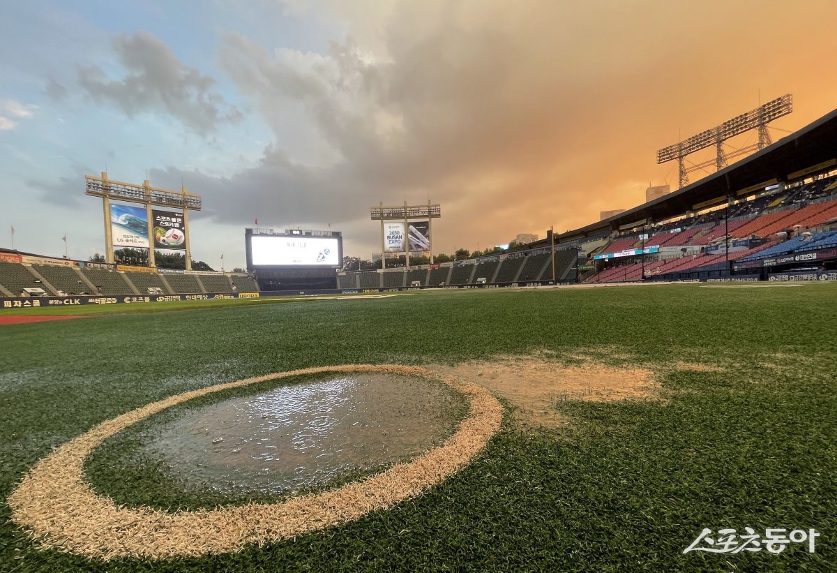‘2023 신한은행 SOL KBO리그’ KIA 타이거즈와 두산 베어스 경기가 열릴 5일 서울 잠실야구장에 비가 내리고 있다.
